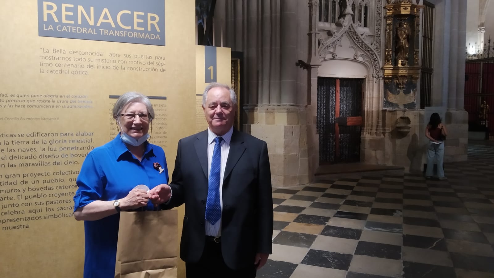 Una palentina afincada en Bilbao, que ha accedido a la exposición Renacer de la Catedral este mediodía, ha redondeado la cifra de visitas y ha recibido como obsequio recuerdos de la Catedral