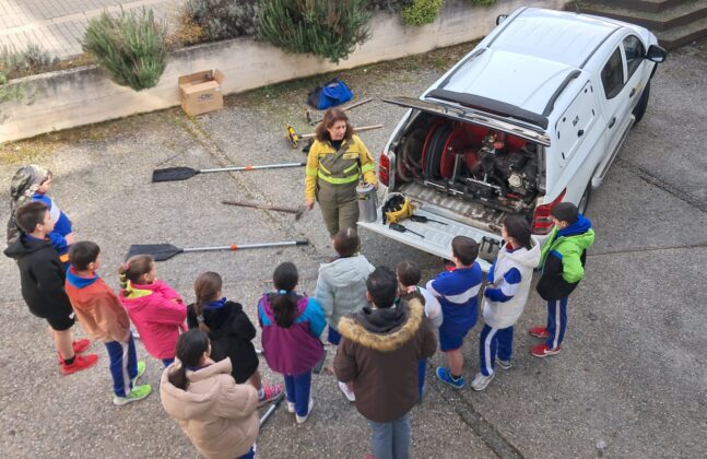 Otro de los paneles está dedicado a la equipación utilizada por las brigadas de extinción de incendios forestales. Coincidiendo con el Día Mundial de los Bosques, se ha podido ver también un vehículo todoterreno, dotado de bomba de agua, facilitada por técnicos de la empresa pública TRAGSA, contratada por el Ministerio para la Transición Ecológica y Reto Demográfico, que han sido los encargados de guiar a los visitantes, chicos y chicas de educación primaria de los dos colegios de la localidad: CEIP Castilla y León y colegio San Gregorio.