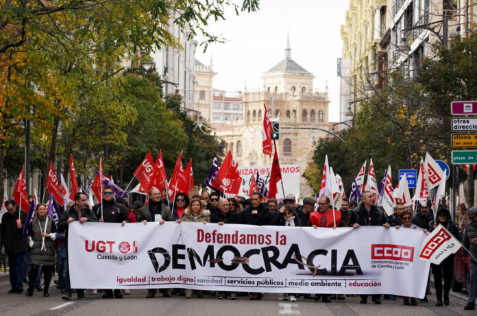 Antes del inicio de la manifestación, ambos líderes sindicales autonómicos advirtieron de que los principios y valores democráticos están siendo cuestionados y, en muchas ocasiones, “pisoteados” en Castilla y León “por la extrema derecha instalada cómodamente en el Gobierno junto al PP”.