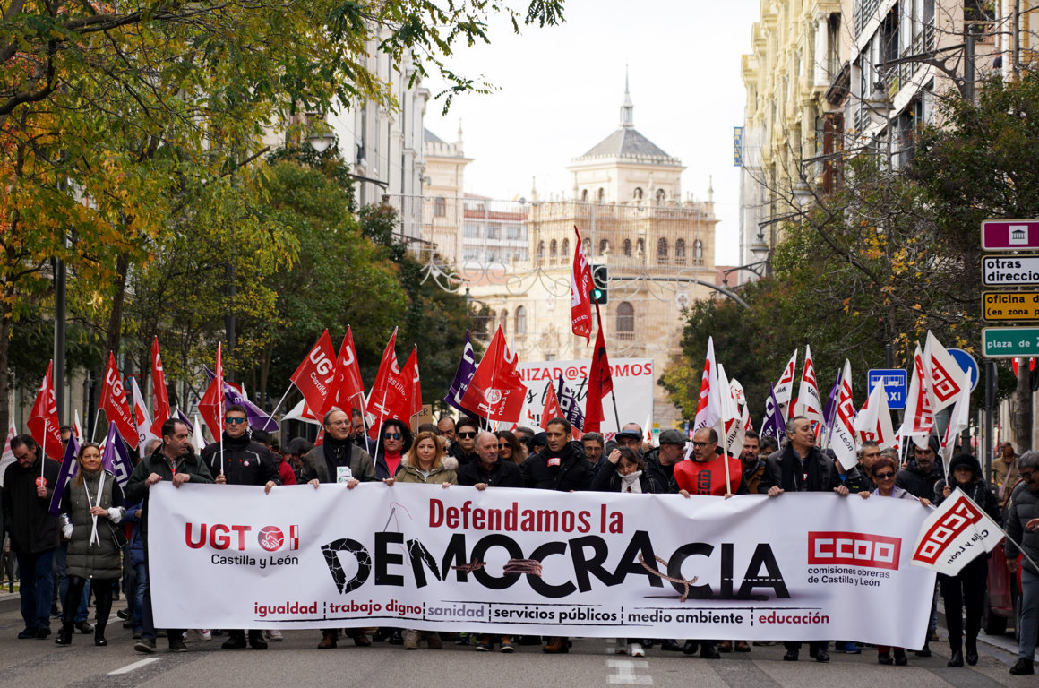 Miles de personas, cerca de 5.000 según la Delegación del Gobierno y más de 6.000 para los sindicatos, salieron hoy a las calles de Castilla y León en defensa de la democracia y en contra de las políticas de Vox en la Junta, en una protesta convocada por CCOO y UGT, que remarcaron que mantendrán las movilizaciones hasta la salida de los miembros del partido de Abascal del Gobierno autonómico.