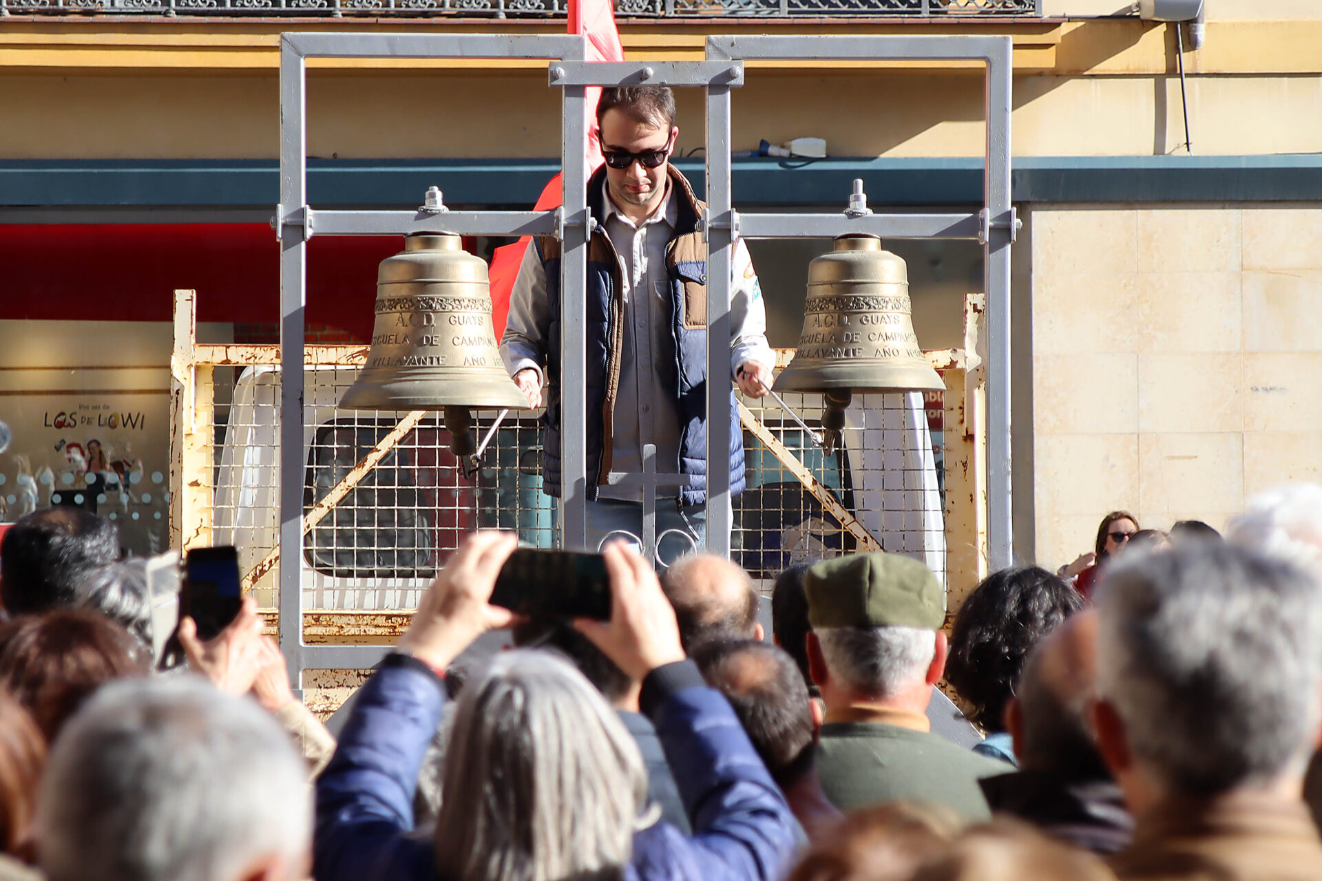 La plaza de Botines de León se convirtió esta tarde en escenario de la exhibición de toques protagonizada por campaneros de la provincia y de las vecinas Zamora y Palencia, que utilizaron campanarios portátiles para dejar constancia de su manejo de una práctica incluida en la Lista Representativa de Patrimonio Cultural Inmaterial de la Humanidad de la Unesco.