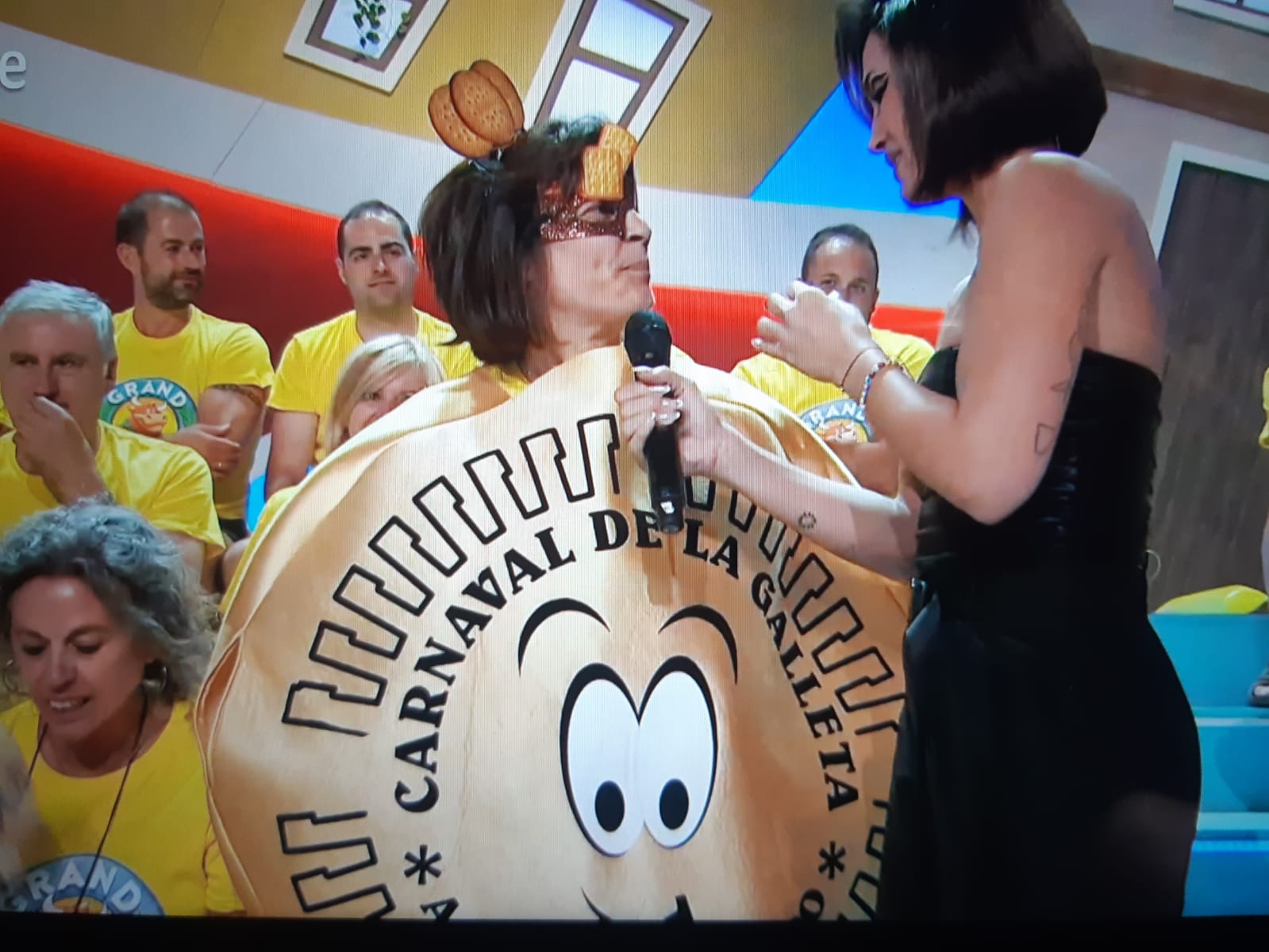 Michelle Calvó entrevista a una vecina de Aguilar encargada de promocionar el Carnaval de la Galleta en el programa de la final del Grand Prix. / RTVE