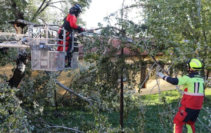 Viento que ha provocado el desprendimiento de ramas, desplazamiento de contenedores y algunos daños materiales en la ciudad de Palencia. En total, 12 salidas de los Bomberos, entre las más destacables la caída de una rama sobre un vehículo junto al Hospital San Telmo, el desprendimiento de un nido de cigüeña desde lo alto de la catedral y la retirada del cartel anunciador del Hotel Monclús, en la calle Menéndez Pelayo.