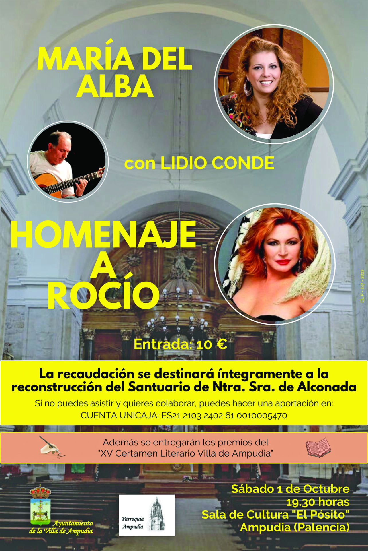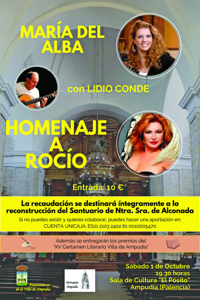 1 de OCTUBRE. 19:30 horas. Concierto Benéfico Homenaje a Rocío Jurado. La recaudación se destinará íntegramente a la reconstrucción del Santuario de Nuestra Señora de Alconada. María del Alba con Lidio Conde ofrecerán este concierto que tendrá lugar en la Sala de Cultura “El Pósito”. El precio de la entrada será de 10 euros. Los que no puedan asistir pero deseen colaborar pueden hacer su aportación. Además, durante el concierto se entregarán los premios del XV Certamen Literario Villa de Ampudia.