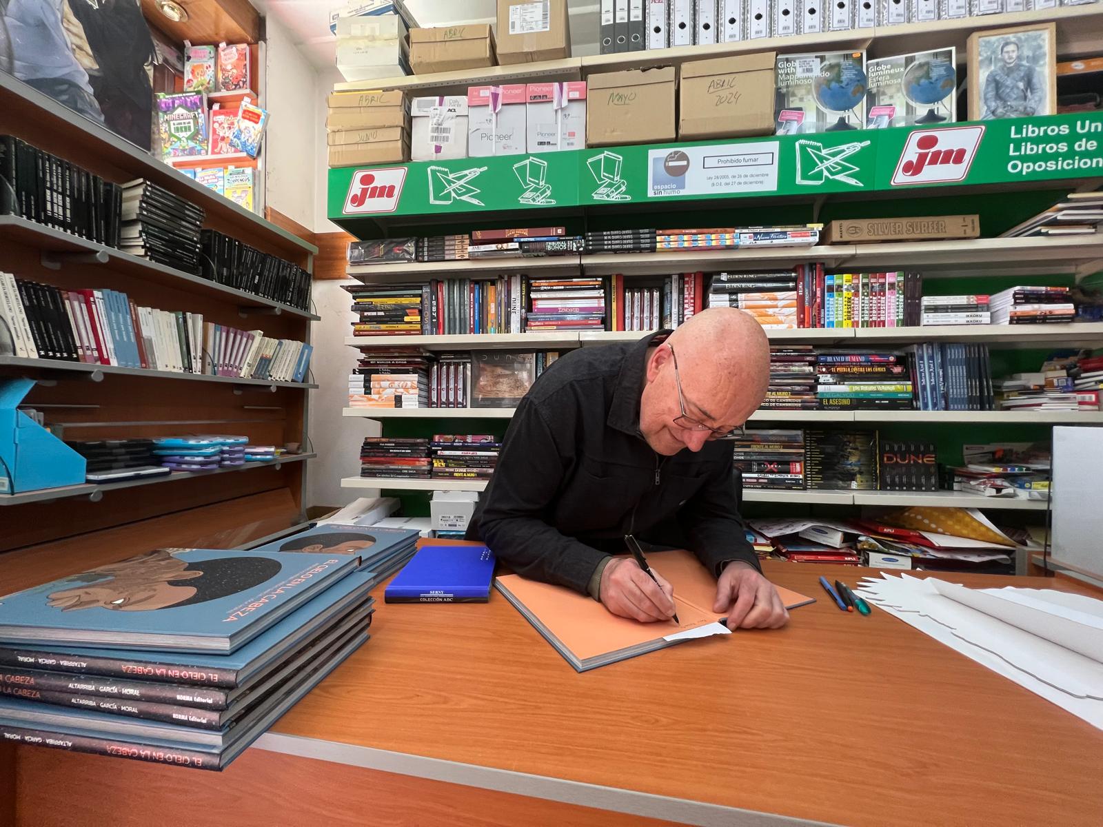Antes de su cita en la Biblioteca Pública, el ensayista aragonés tuvo tiempo para pasar por la Librería JM, donde le recibieron con una alfombra roja, literalmente. Allí tuvo la oportunidad de firmar ejemplares y charlas con varios aficionados del noveno arte.