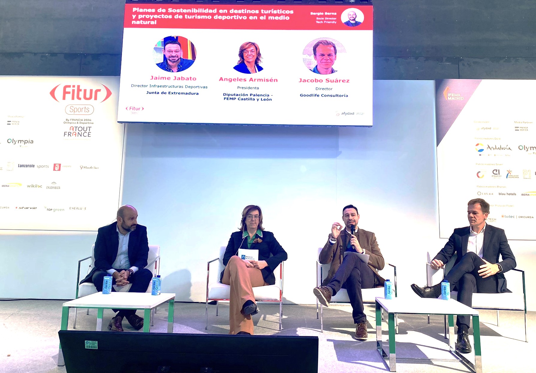 La presidenta de la Diputación, Ángeles Armisén, ha participado esta mañana en la mesa redonda ‘Planes de Sostenibilidad en Destinos Turísticos y proyectos de turismo deportivo en el medio natural’ en el marco de Fitur Sports 24 que se celebra dentro de la Feria Internacional de Turismo en IFEMA, Madrid. Allí ha compartido mesa con el director de Infraestructuras Deportivas de la Junta de Extremadura, Jamie Jabato,  el director de Goodlife Consultoría, Jacobo Suárez, y el socio director de TECH friendly, Sergio Serna.