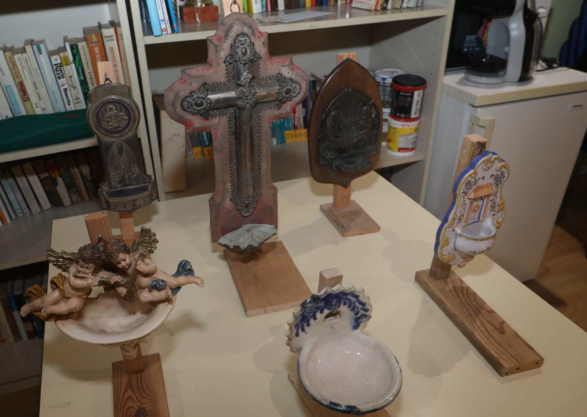 Una benditera, explica Luis con entusiasmo, es un recipiente para agua bendita que se cuelga en la pared, usado para santiguarse al entrar o salir de un espacio. También conocidas como aguabenditeras o pilas benditeras, estas piezas evocan las fuentes de agua presentes en lugares sagrados desde tiempos inmemoriales. Su historia en Europa comienza en el siglo XV, cuando adornaban las fachadas de las iglesias. Con el tiempo, pasaron al interior de los templos, luego a las entradas de las casas y, finalmente, a las cabeceras de las camas en los hogares rurales. “El cura las bendecía el Sábado Santo, la gente mojaba los dedos, se santiguaba y rezaba una jaculatoria”, cuenta Luis. “Era una creencia respetable, una forma de protección contra los malos espíritus, incluso contra el diablo, según se decía entonces”.