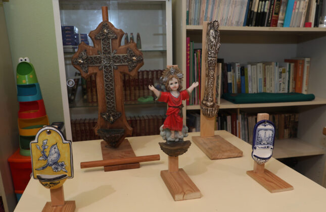 Luis no solo colecciona benditeras; su memoria abarca una época compleja que también ha querido preservar. Nacido en 1946, conoció de primera mano las escuelas franquistas de los años 50 y 60. En el museo, ha recreado una de ellas con pupitres de los años 40, libros, enciclopedias, un ábaco, una pizarra y los inevitables símbolos de la época: un crucifijo, un retrato de Franco y otro de José Antonio Primo de Rivera. “Eran escuelas divididas entre chicos y chicas. En Espinosa había unos 189 alumnos entonces; hoy, solo hay dos niños en el pueblo, y la escuela ya no existe”, relata con nostalgia y un toque de tristeza.