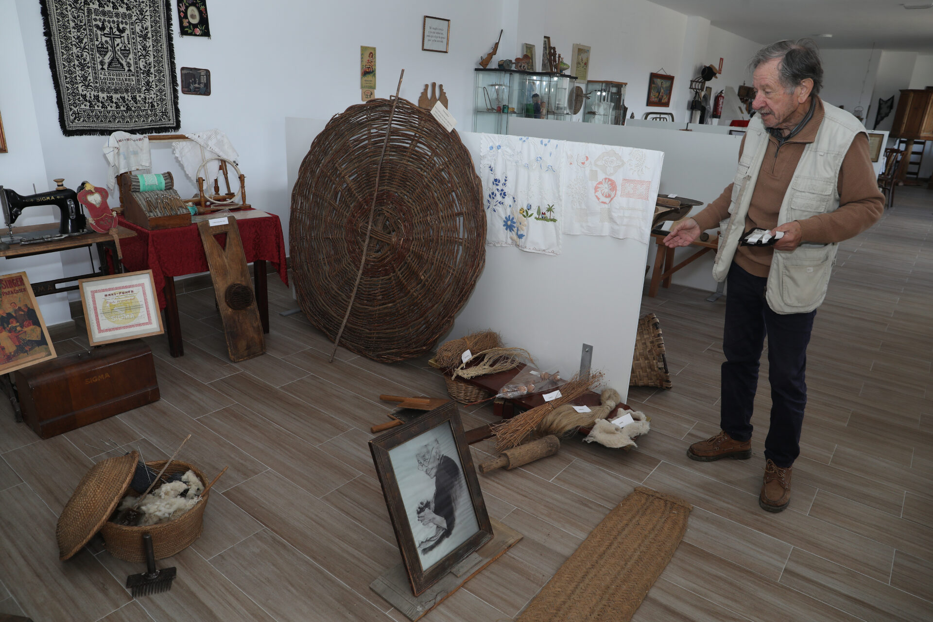 En el corazón de la Tierra de Campos, Espinosa de Villagonzalo se alza como el hogar del proyecto de Luis. Aunque reside en Madrid, su vínculo con el pueblo es inquebrantable. Allí, en un espacio integrado en la red de museos de la Diputación de Palencia, gestiona el Museo Etnográfico, un lugar donde el pasado cobra vida. “Quería recordar nuestra historia más reciente, la del medio rural”, explica. El museo reúne objetos que formaron parte de la vida cotidiana entre 1840 y 1950: aperos de labranza, bicicletas, juguetes, fotografías y máquinas de coser, como las curiosas Peugeot, que precedieron a los coches de la marca. Cada pieza, explicada por Luis o Concepción, transporta a los visitantes a los días en que el campo y el hogar eran el sustento de las familias.