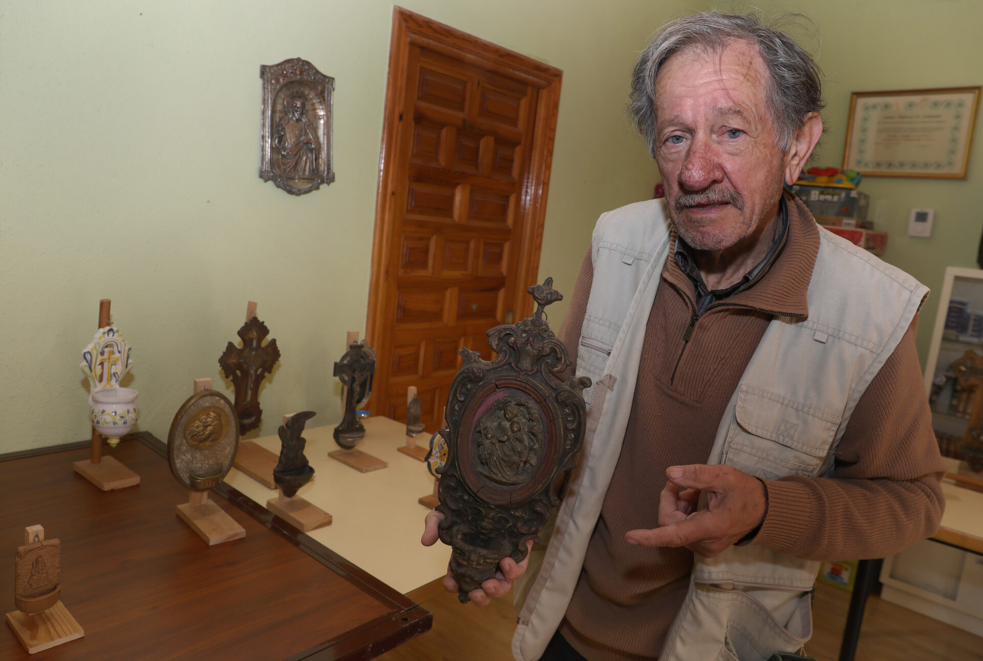 La labor de Luis trasciende la simple acumulación de objetos. Su colección de benditeras, aunque aún no exhibida en su totalidad, representa un esfuerzo por rescatar la fe y las creencias de generaciones pasadas. “Toda la vida las vi en las camas de mi familia, y empecé poco a poco”, cuenta. Su meta de llegar a las cien piezas no es solo un número, sino un compromiso con la memoria. Cada benditera, ya sea de cerámica del siglo XX o de madera del XIX, guarda un pedazo de Castilla: su devoción, su arte, su vida cotidiana.