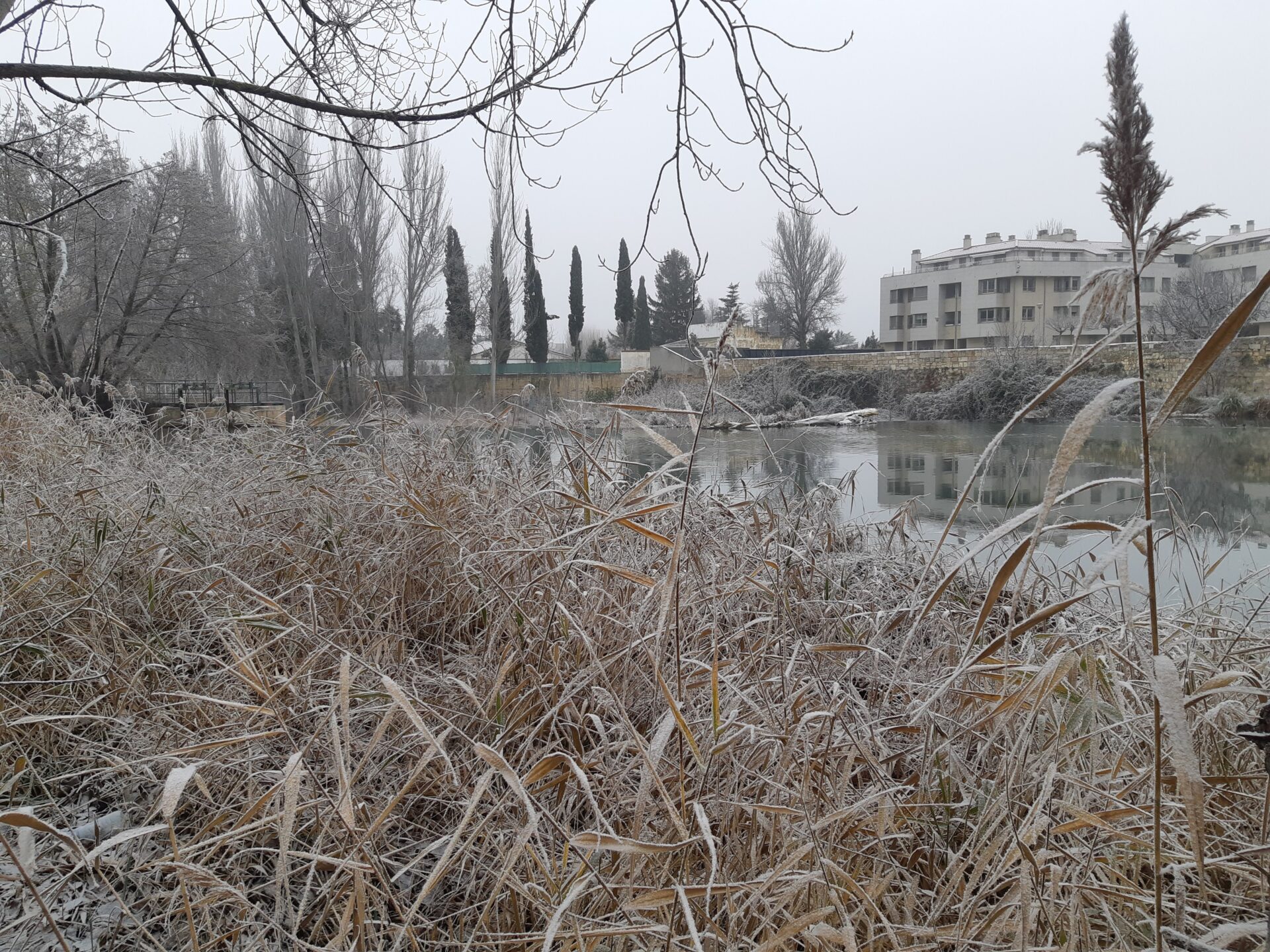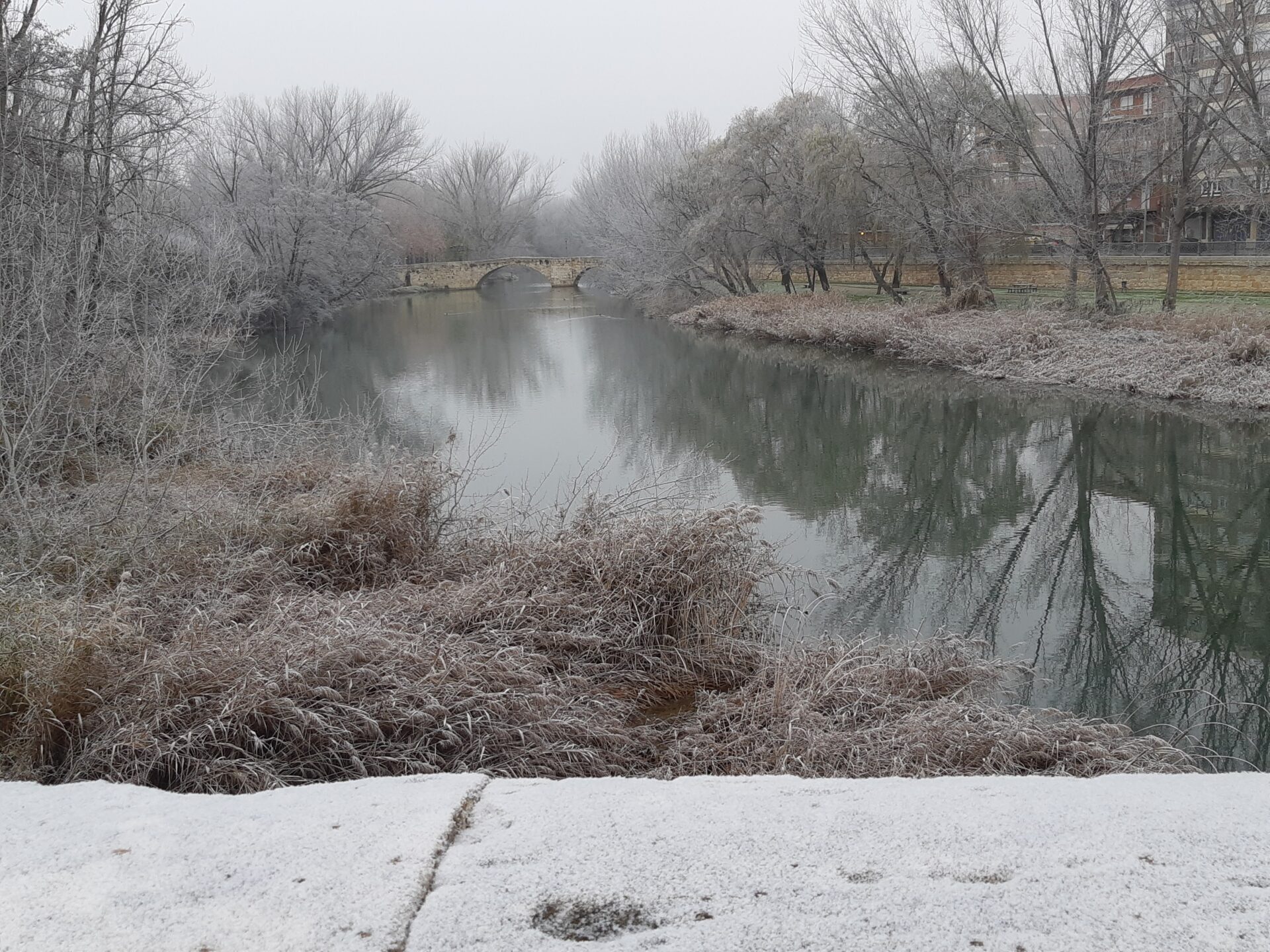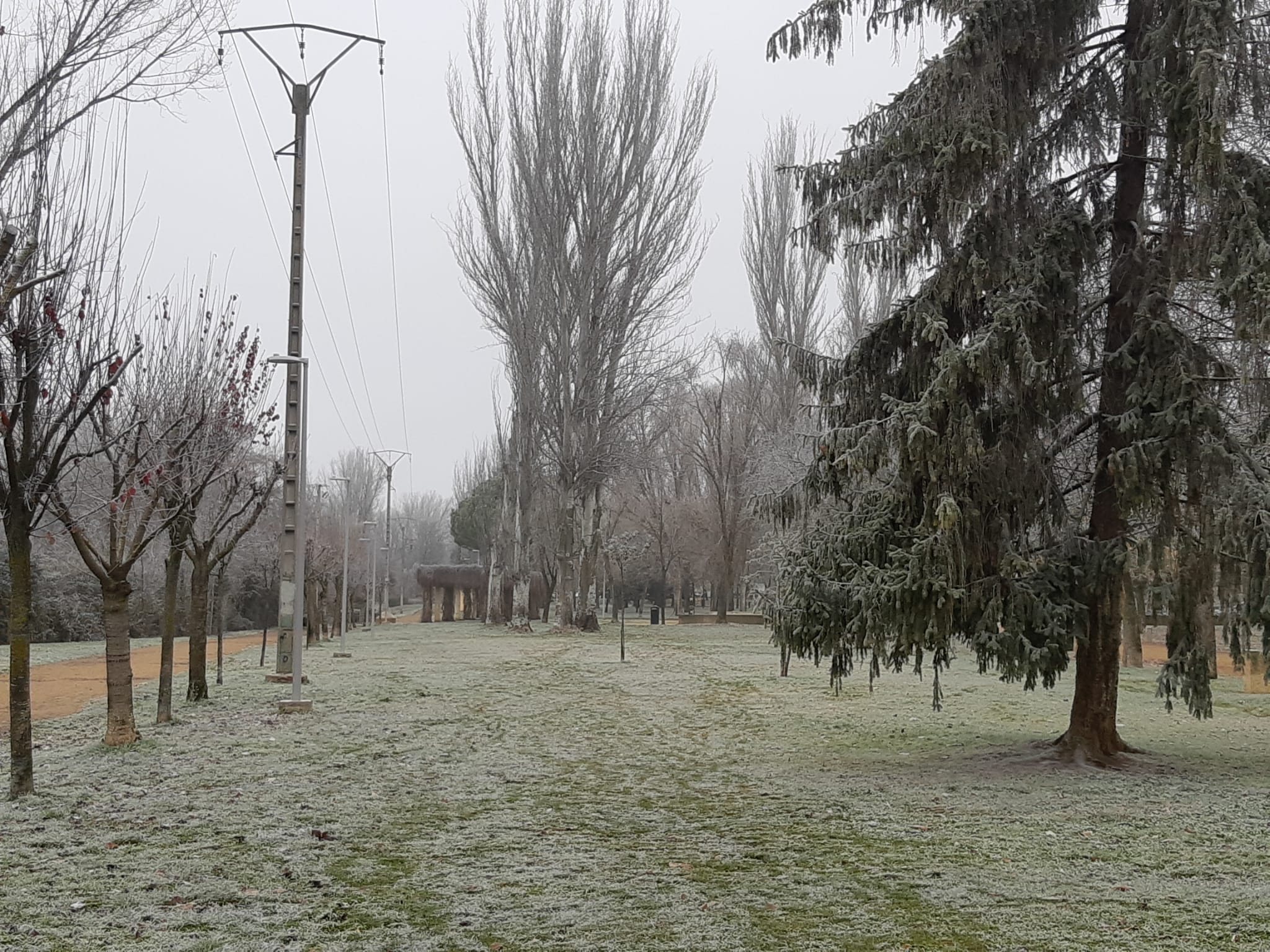 La unión de la niebla, casi sempiterna en  Palencia estos días, y las heladas propias de estas fechas, y que ha mantenido las temperaturas por debajo de los 0 grados desde las 18 horas de ayer martes llegando a los -3,5 esta madrugada, han propiciado que las gotas de agua de las que está compuesta la niebla se hayan convertido en cristales de hielo, dando un ambiente navideño, idílicamente navideño (Oh, blanca Navidad), pero sin el engorro de la nieve. Y aún se mantiene, dado que los termómetros no han superado en ningún momento los 0 grados.