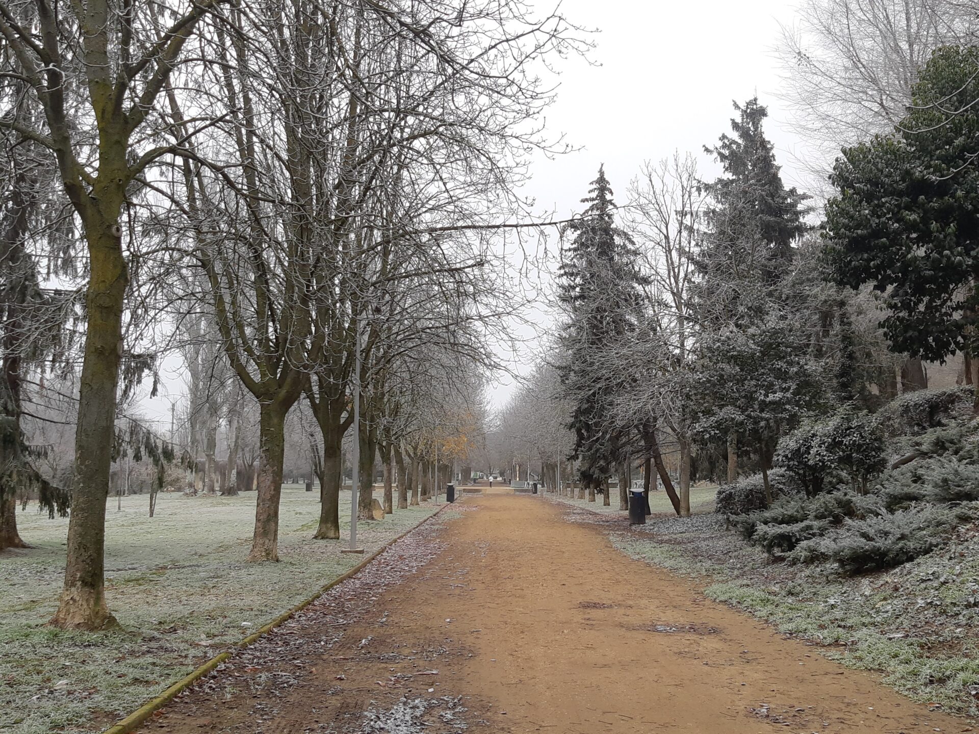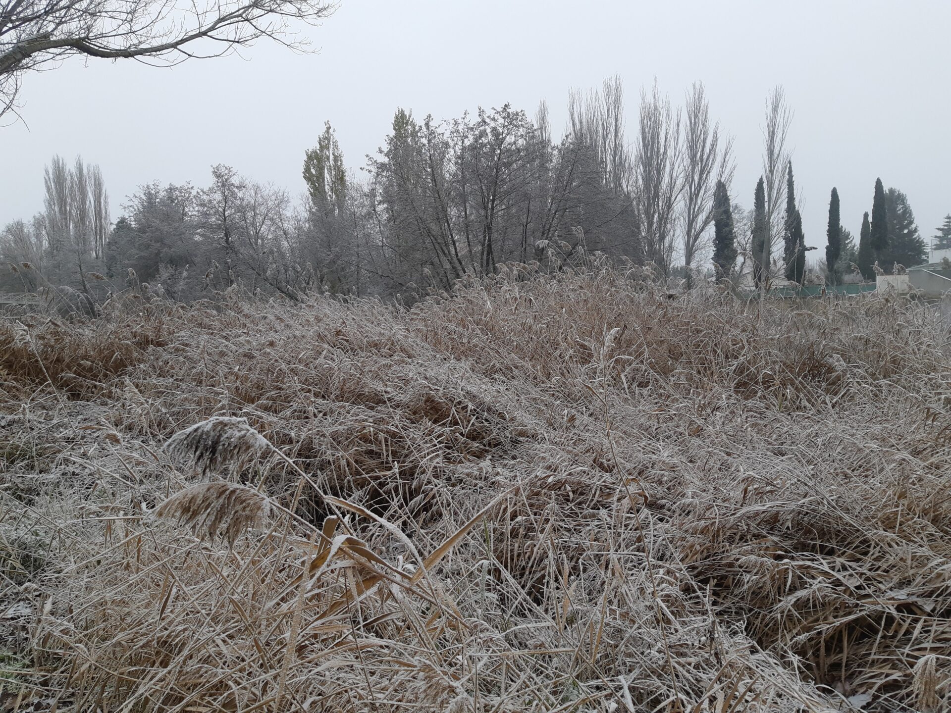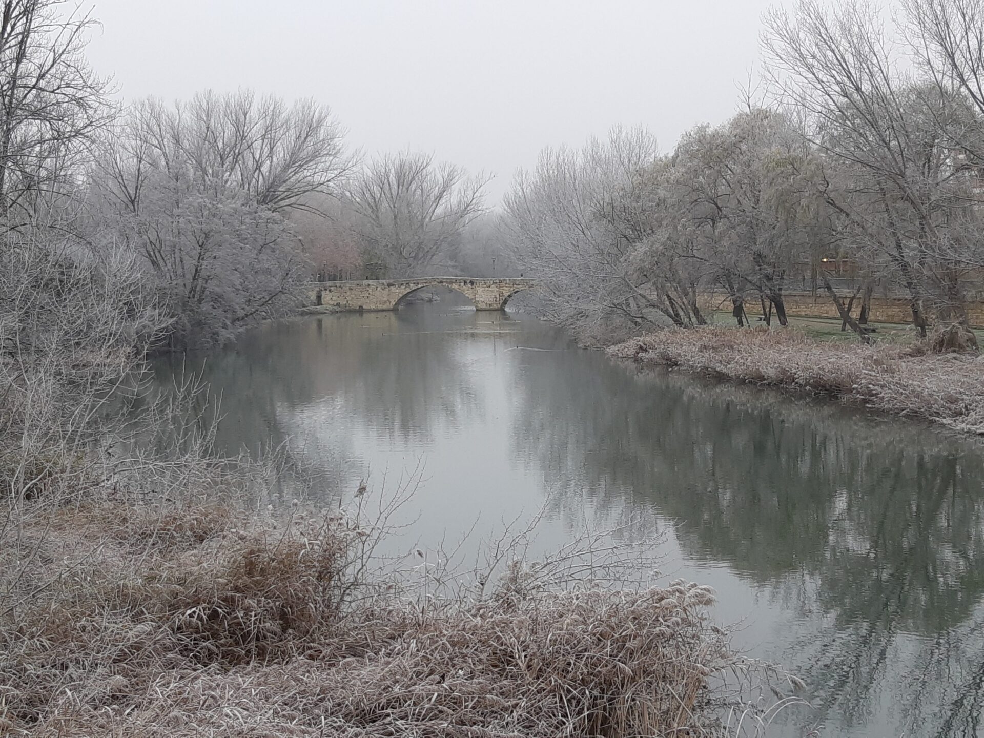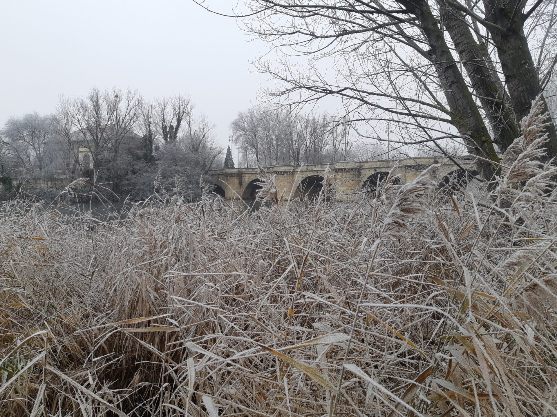 La unión de la niebla, casi sempiterna en  Palencia estos días, y las heladas propias de estas fechas, y que ha mantenido las temperaturas por debajo de los 0 grados desde las 18 horas de ayer martes llegando a los -3,5 esta madrugada, han propiciado que las gotas de agua de las que está compuesta la niebla se hayan convertido en cristales de hielo, dando un ambiente navideño, idílicamente navideño (Oh, blanca Navidad), pero sin el engorro de la nieve. Y aún se mantiene, dado que los termómetros no han superado en ningún momento los 0 grados.