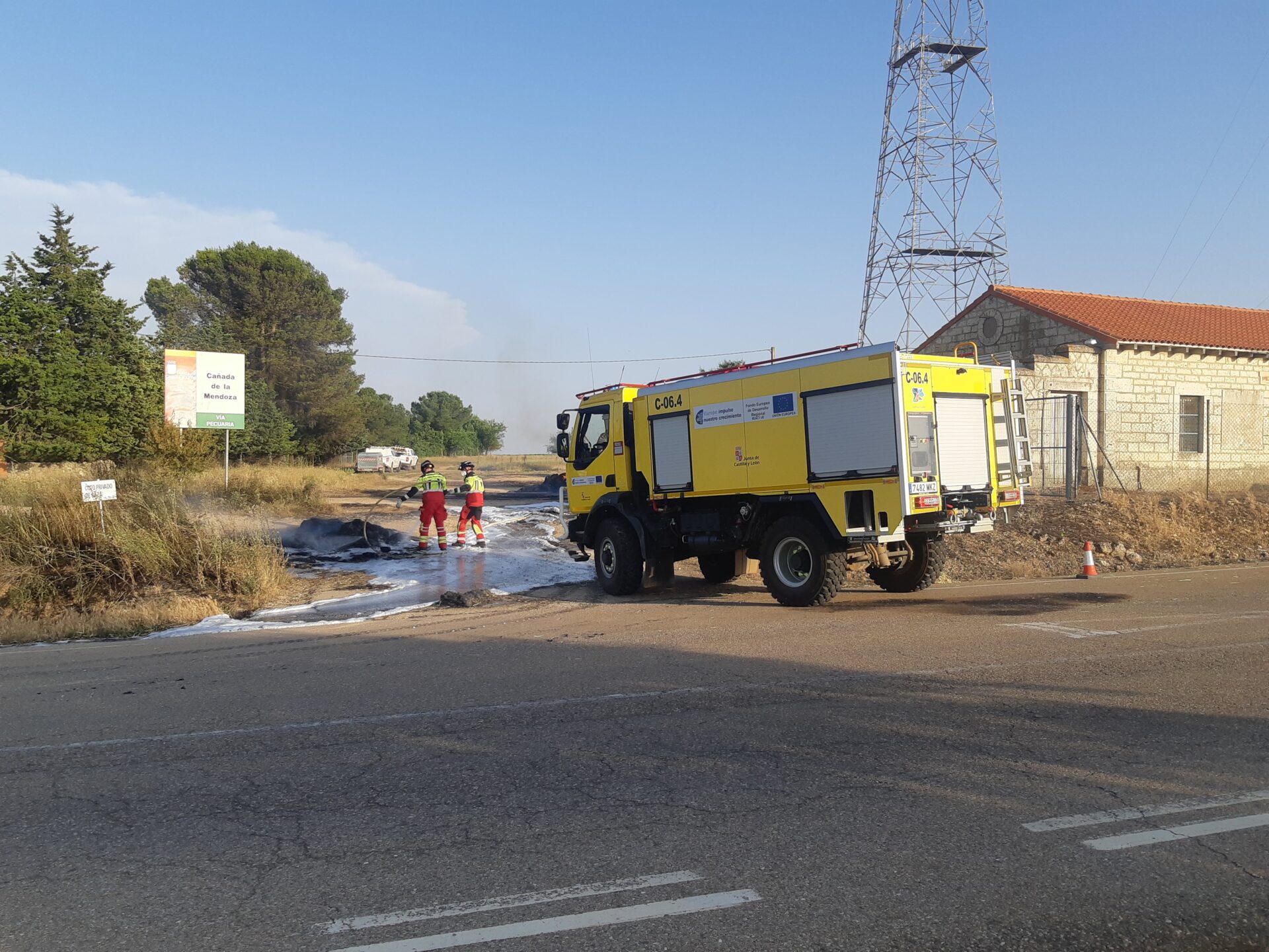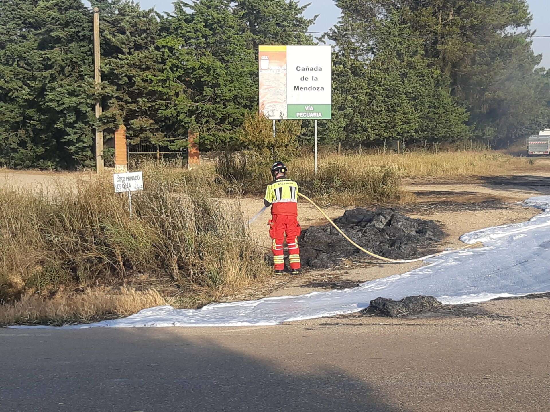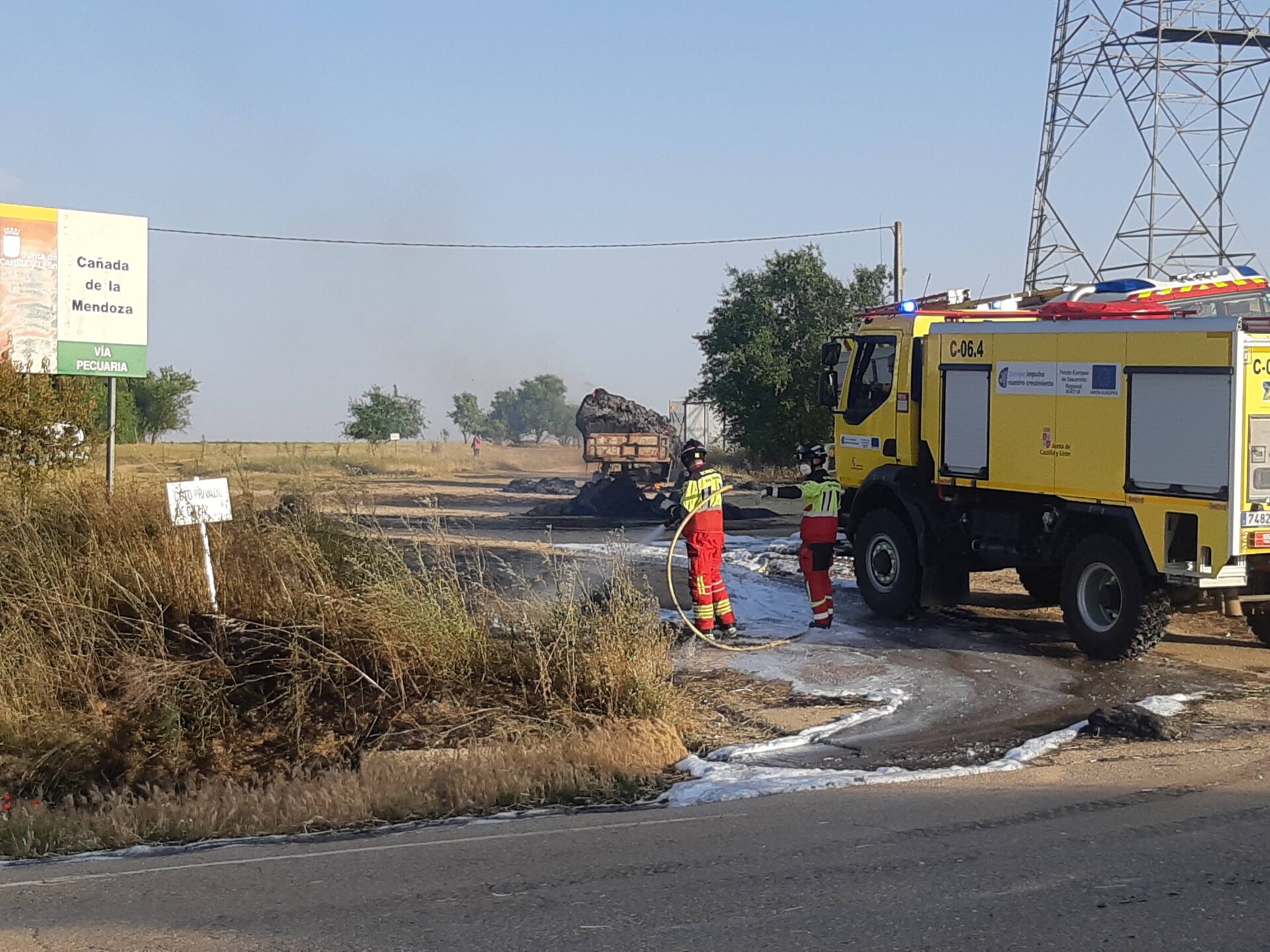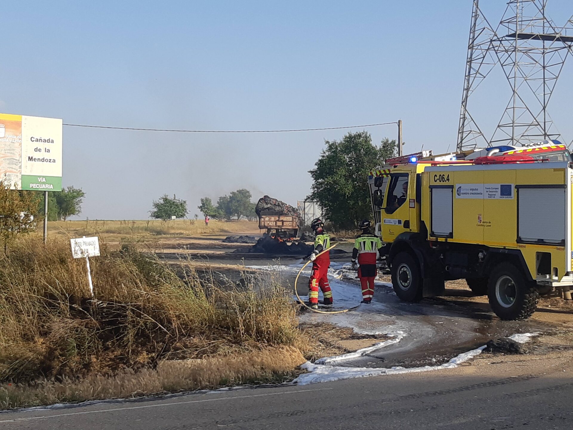 “Ahora ya está apagado, pero estaba la paja ardiendo en la carretera”, señalaba a Palencia en la Red un testigo mientras, apartado, en el remolque todavía se veían las llamas.