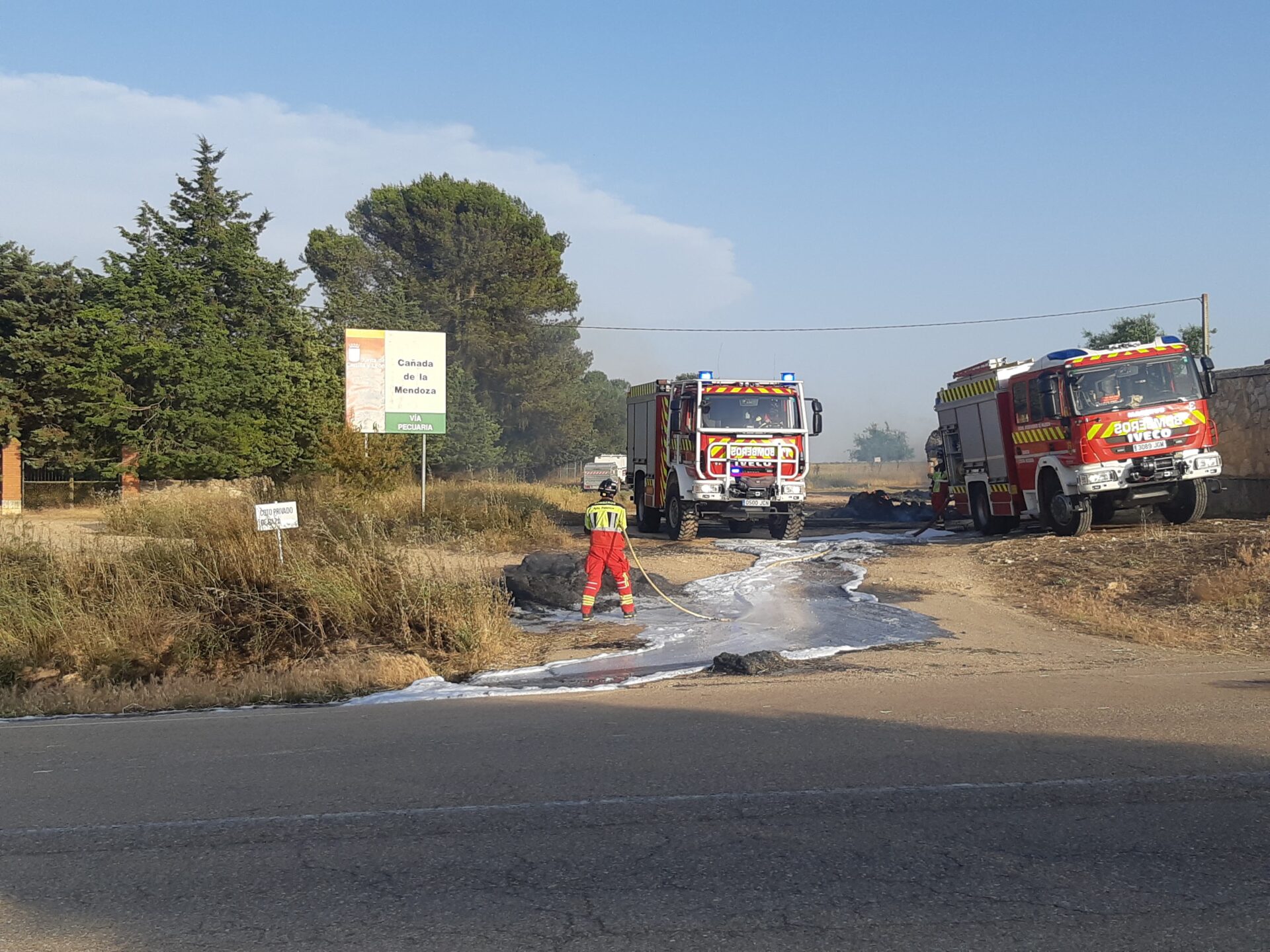 El incendio de un vehículo en la carretera de Ampudia provocó unas llamas que obligaron a intervenir a varias dotaciones y dos helicópteros