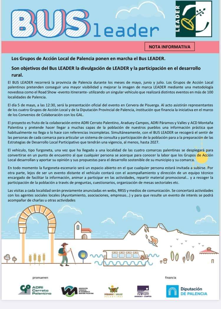 El BUS LEADER recorrerá la provincia de mayo a julio. Los Grupos de Acción Local palentinos pretenden conseguir una mayor visibilidad y mejorar la imagen de marca LEADER mediante una metodología novedosa como el Road Show -evento itinerante- utilizando un singular vehículo que realizará distintos eventos en más de 100 localidades de Palencia.