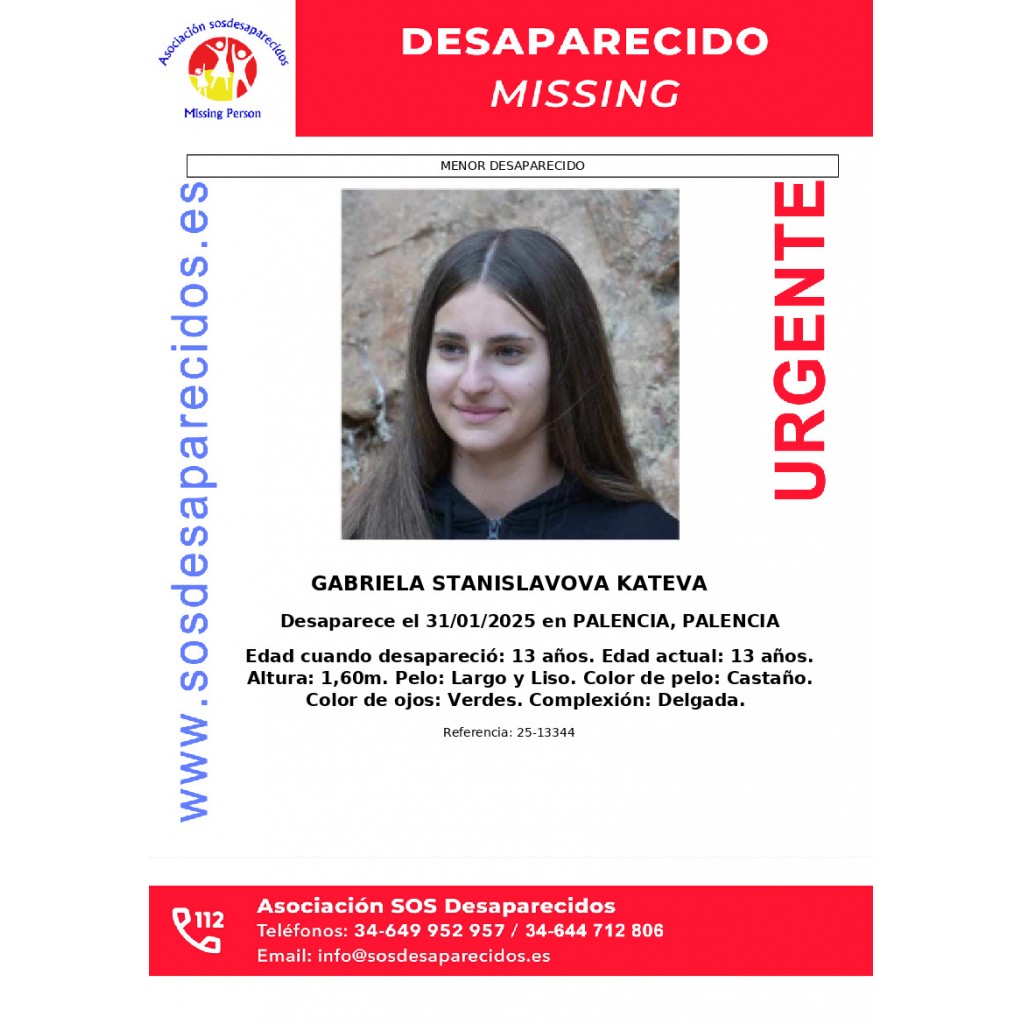 Una menor de 13 años, que responde al nombre de Gabriela Stanislavova Kateva, desapareció el pasado viernes, 31 de enero, en la ciudad de Palencia, según recoge la alerta de la Asociación SOSdesaparecidos.