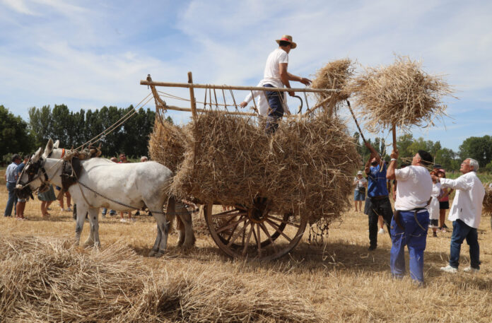 Un homenaje a la tradición, a las labores agrícolas y a los hombres y mujeres del campo. Durante la Fiesta de la Trilla, la localidad palentina de Castrillo de Villavega ha viajado en el tiempo y recordó cómo se trabajaba hace años cuando las nuevas tecnologías no habían llegado al sector agroganadero. Un año más, los aperos, las segadoras, los carros o los arados de reja dejaron de ser casi recuerdos de coleccionista para volver, al menos durante unas horas, a pisar el campo.