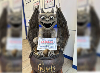 El día que la administración de lotería de la calle Barrio y Mier recibía la estatua de su mascota de la suerte reparte un...