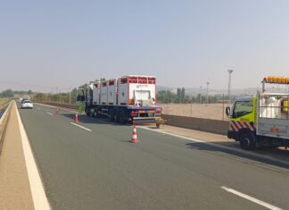 El siniestro de un camión con mercancías peligrosas de obliga a cortar un carril de la A-67 en Villamuriel en dirección a Santander durante horas