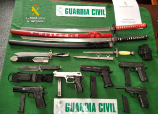 Agentes de la Guardia Civil incautaron cinco pistolas, dos catanas y tres cuchillos durante la detención de un hombre como presunto autor de un...