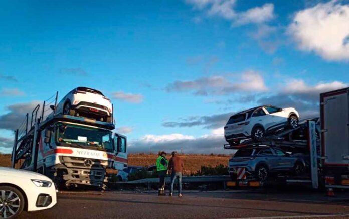 En el accidente se han visto implicados hasta ocho vehículos, entre ellos dos camiones de transporte de coches nuevos, según informaron fuentes de la Delegación del Gobierno.