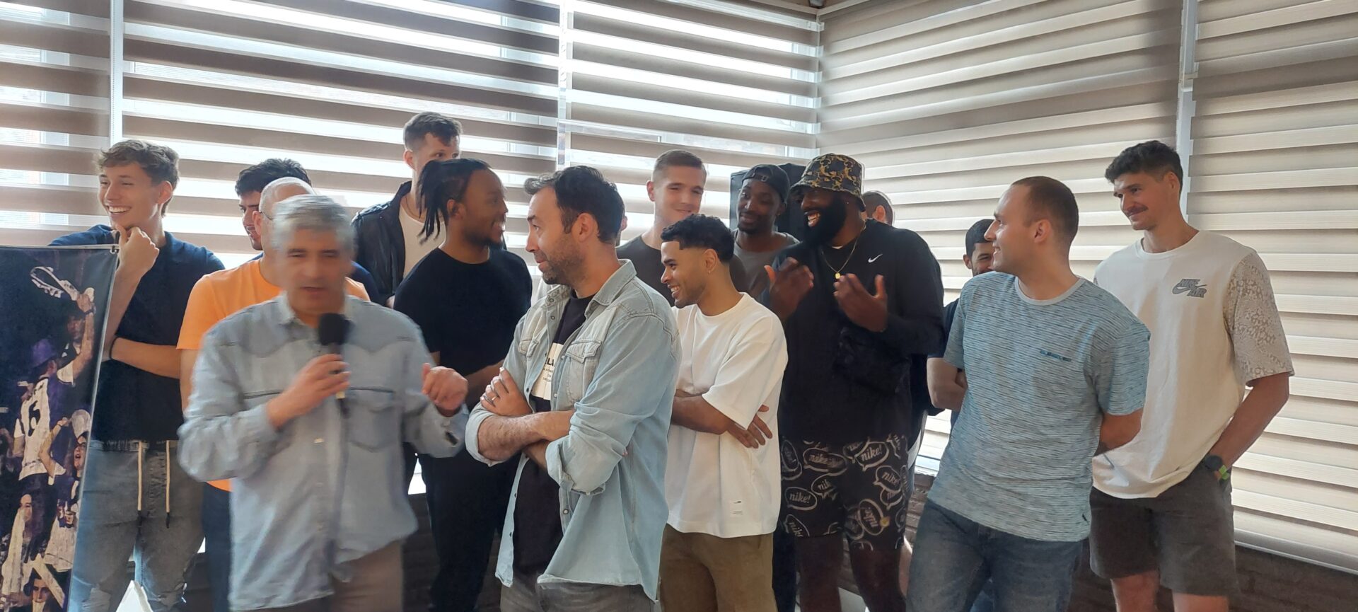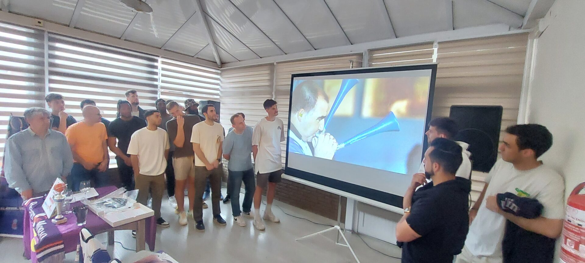 Tras las palabras del capitán llegó el momento de darle otra sorpresa más, una videollamada de sus padres, Chumilla y Conchi, los más fieles seguidores de los logros de su hijo y que no se pierden ni un solo partido juegue donde juegue el equipo morado.
