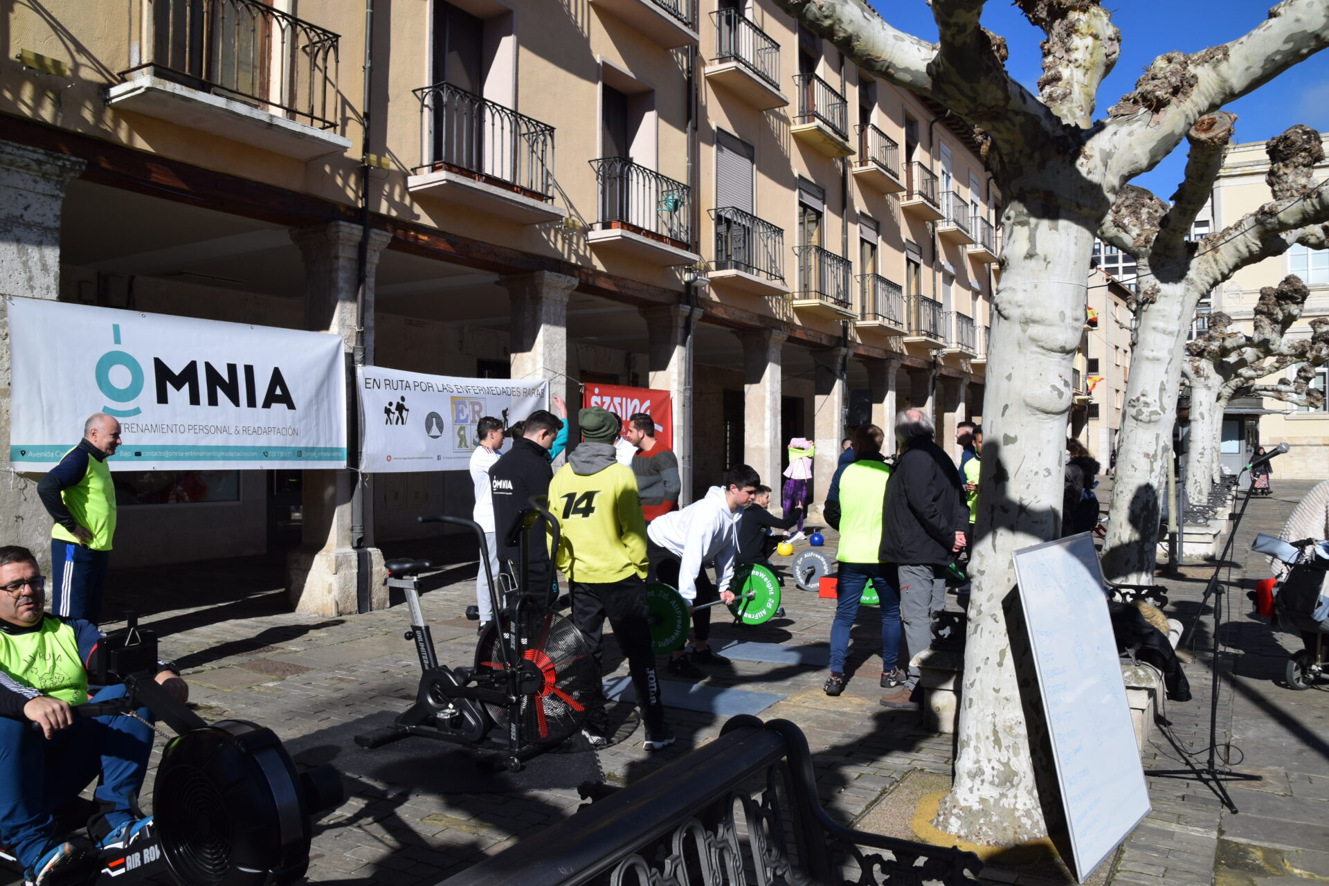 Desde primera hora de la mañana la Plaza Mayor se convirtió en un improvisado gimnasio en el que se desarrollaron actividades para todos los niveles. Sentadillas, flexiones, pesos muertos, remos con barra, saltos con comba, escaladores o cargadas con balón fueron algunos de los ejercicios puesto en práctica por cientos de personas durante esta jornada, desarrollada en colaboración con el Ayuntamiento de Palencia y la Federación Española de Enfermedades Raras (FEDER), la segunda jornada deportiva a favor de la investigación de