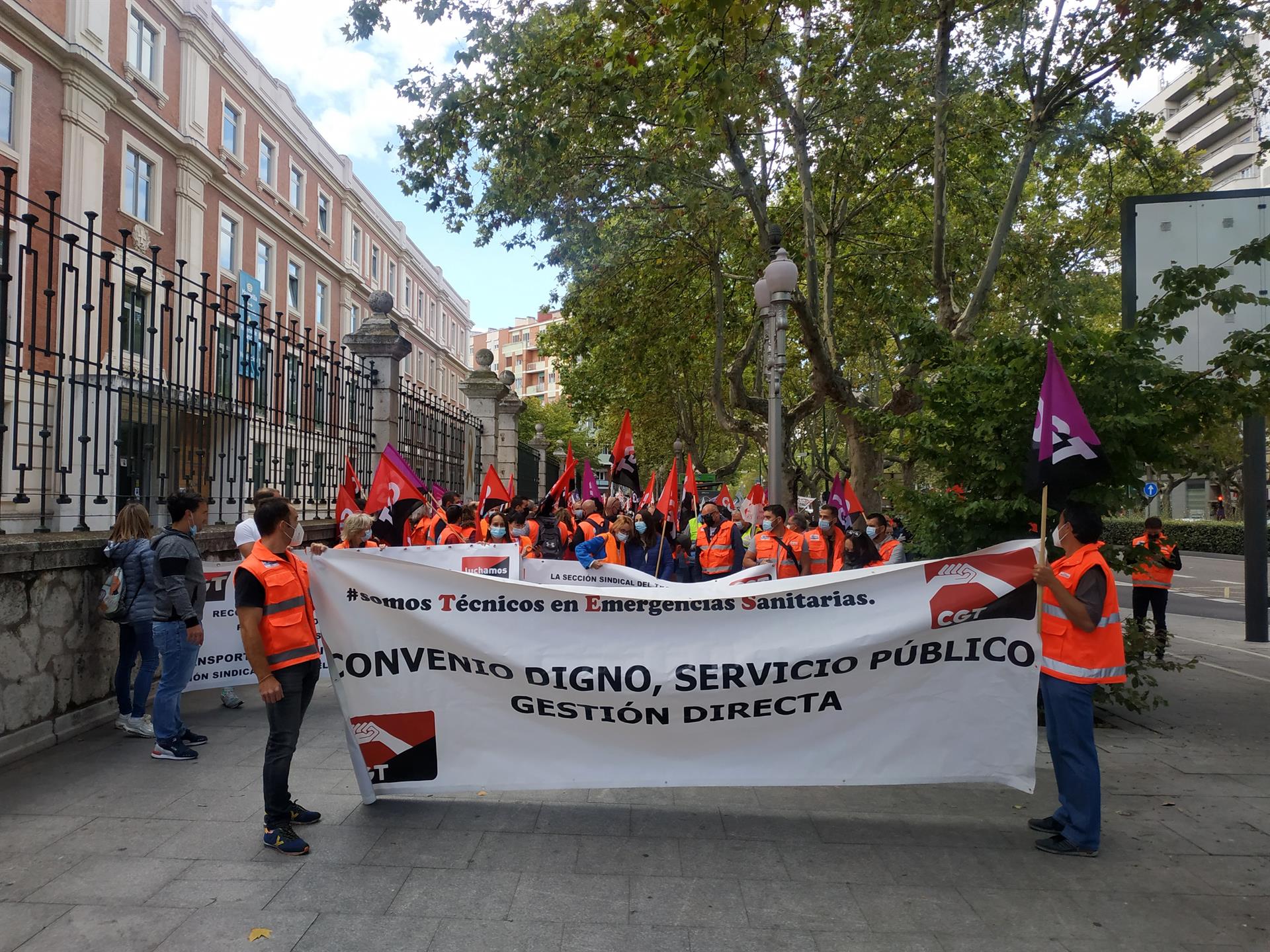 Una concentración multitudinaria a las puertas de la Consejería de Sanidad, en el Paseo de Zorrilla de Valladolid, ante una gran pancarta con el lema ‘Convenio digno, servicio público, gestión directa’, y una posterior manifestación a pie hasta la sede de las Cortes de Castilla y León ha centrado el programa diseñado por los sindicatos convocantes, en el marco de las movilizaciones que vienen realizando en los últimos tres años para lograr, como primer paso, desbloquear el convenio colectivo con la Asociación Regional de Empresarios de Ambulancias de Castilla y León (ALECA).