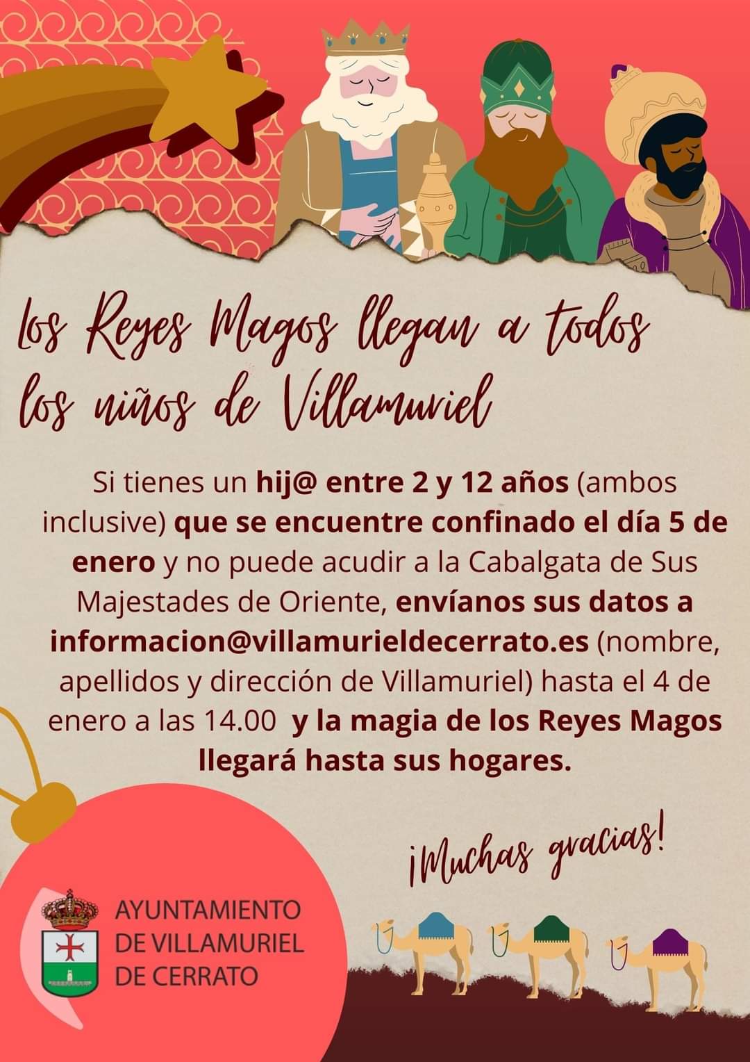 Si tienes un hijo entre 2 y 12 años (ambos inclusive) que se encuentre confinado el día 5 de enero y no puede acudir a la Cabalgata de Sus Majestades de Oriente, puedes enviar sus datos a informacion@villamurieldecerrato.es (nombre, apellidos y dirección de Villamuriel) hasta el 4 de enero a las 14.00h.