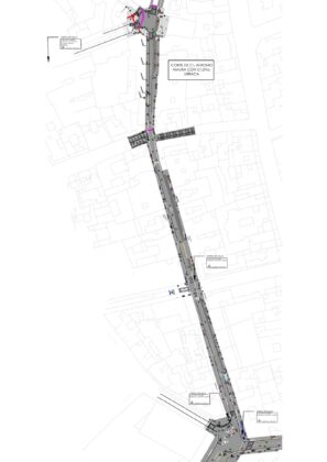 Se colocará un nuevo encintado de bordillo de granito y se amplían las aceras en la zona de aparcamiento con baldosa de terrazo. El pavimento será de adoquín.