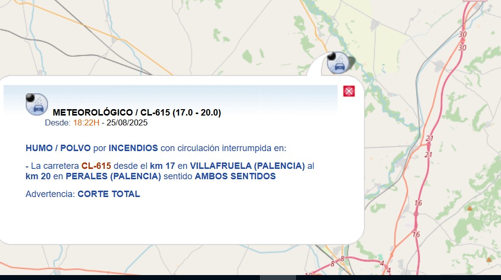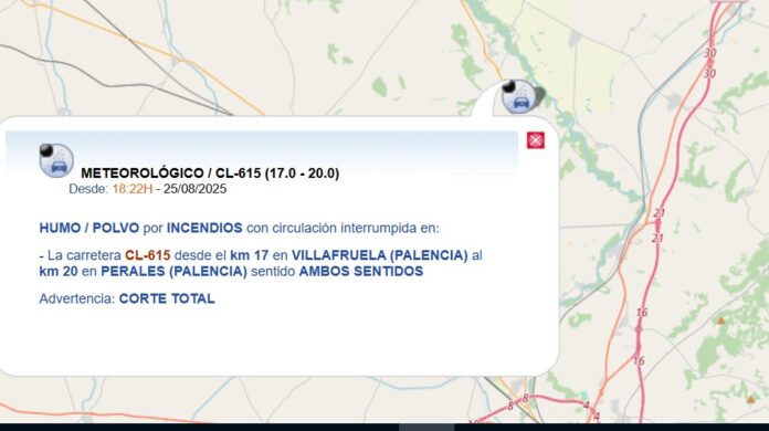 La Dirección General de Tráfico mantiene cortada la carretera CL-615 (Palencia-Guardo) a la altura de La Venta, debido a los incendios forestales que se han dado en la zona durante esta tarde.