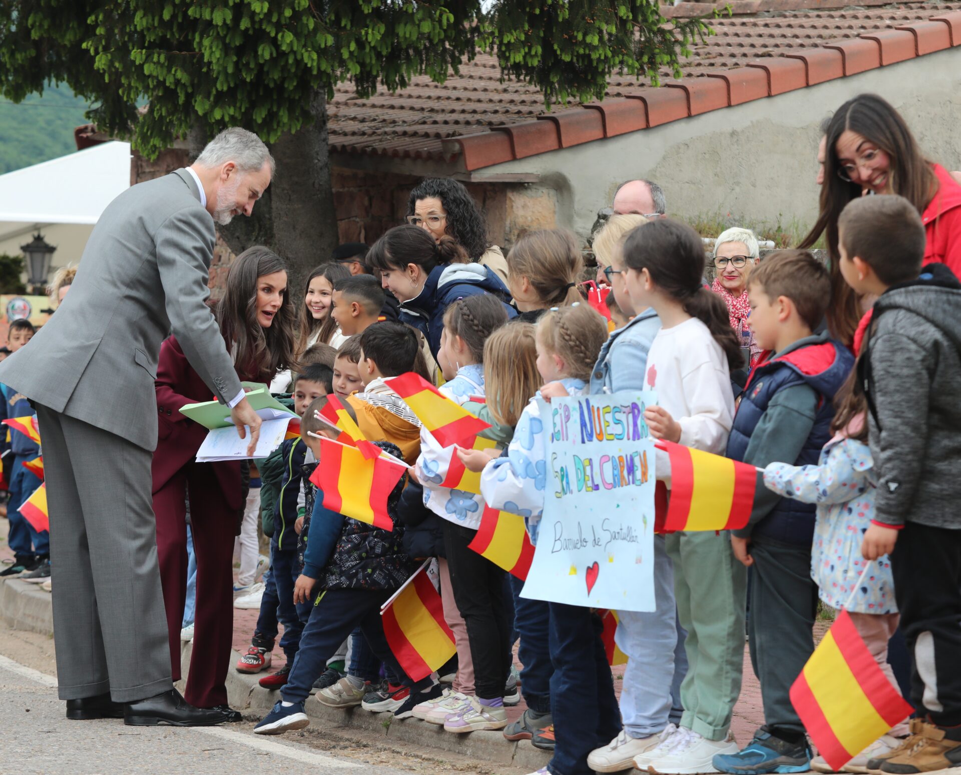 La Reina, con traje granate y blusa blanca, y el Rey, con traje gris y corbata azul, saludaron sonrientes a los centenares de vecinos expectantes junto a grandes banderas de España en la empinada subida que lleva hasta la carpa del acto principal. Entre ellos se encontraban niños y niñas del colegio de Barruelo de Santullán que saltaban de ganas de ver a SS.MM.; tenían preparados carteles y regalos hechos a mano. Doña Letizia, que se mostró cercana en todo momento con la gente, sobre todo con los niños y niñas, se detuvo con ellos. Tanto Felipe como Letizia se pararon a hacer fotos con las personas que habían esperado desde primera hora de la mañana allí su visita.