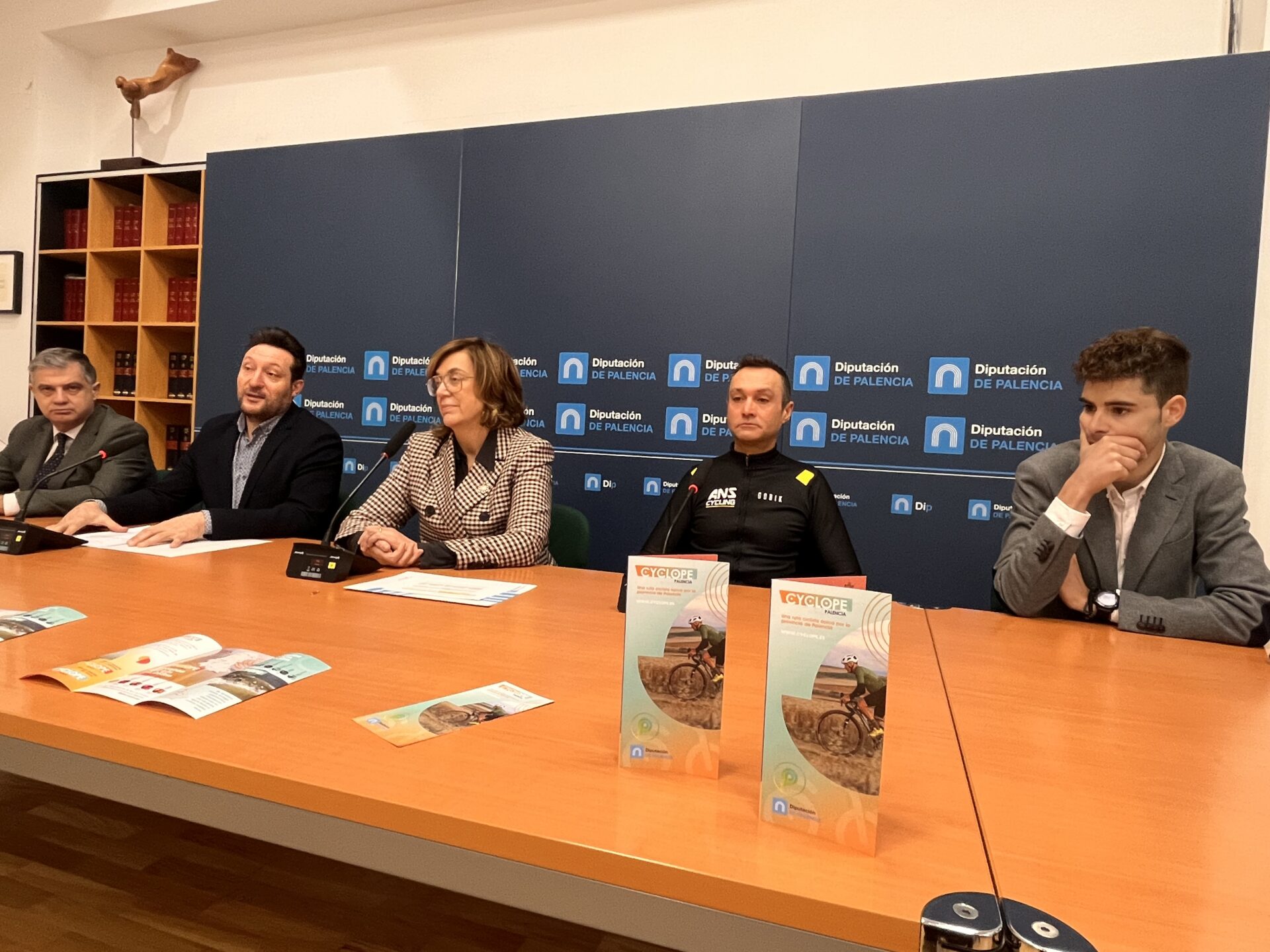 La presidenta de la Diputación de Palencia, Ángeles Armisén, junto al diputado de Deportes, Eduardo Tejido, el Coordinador de Deportes de la Diputación, Enrique Hermoso, y el ciclista palentino David Meléndez, ha anunciado las novedades para el exitoso programa Cyclops, que abarca todas las modalidades ciclistas de la provincia.