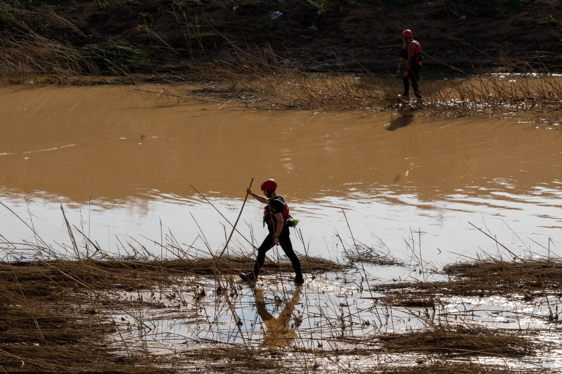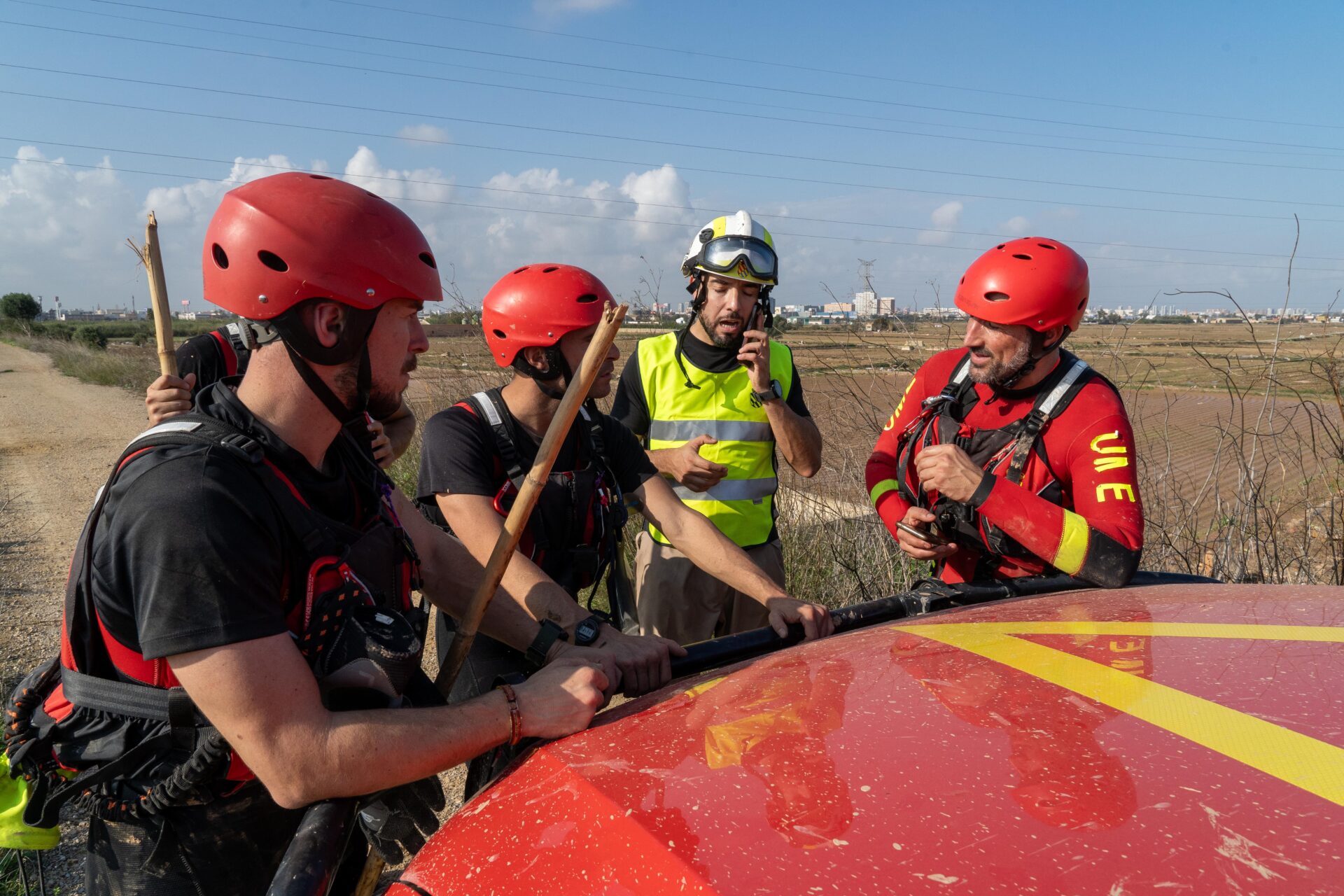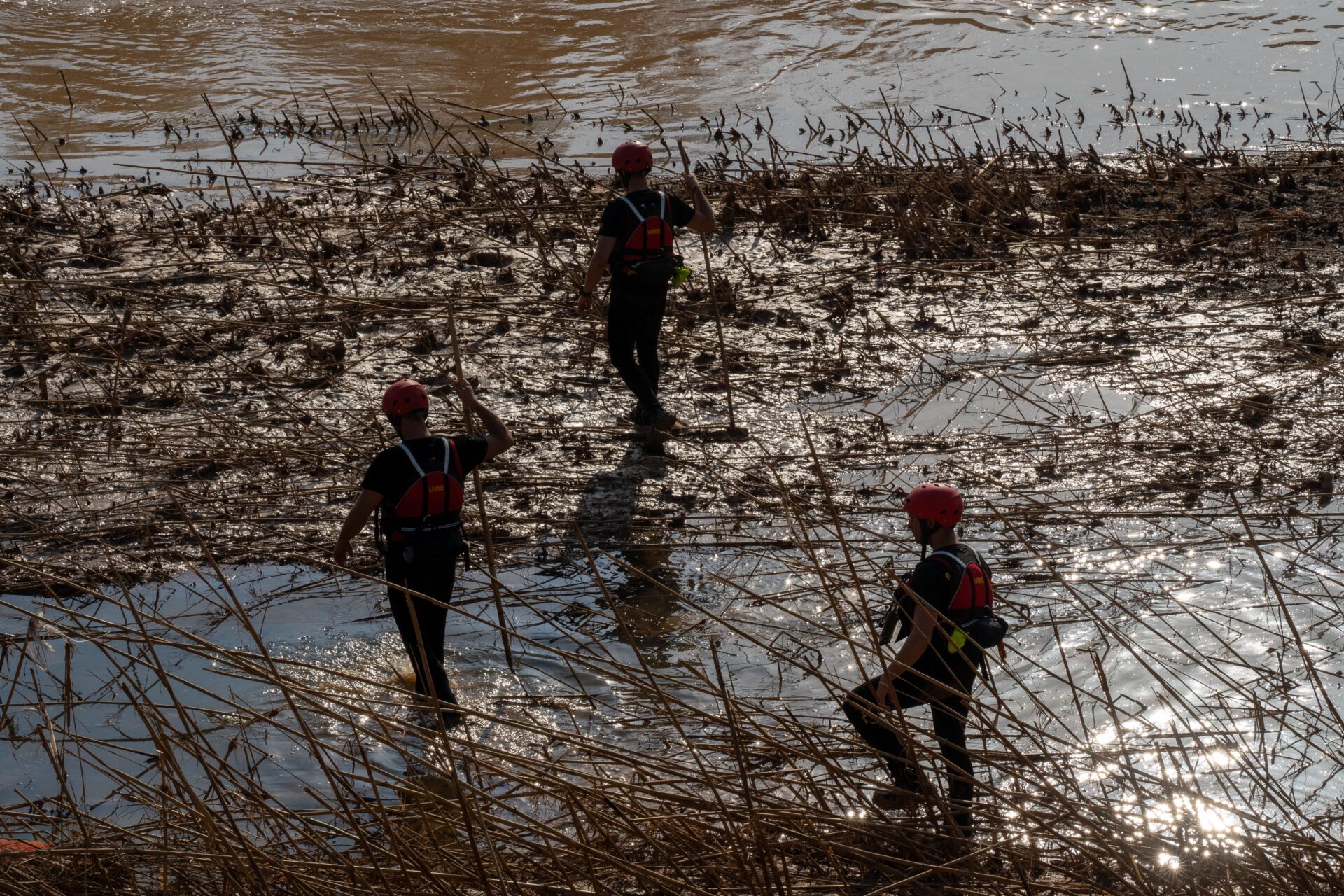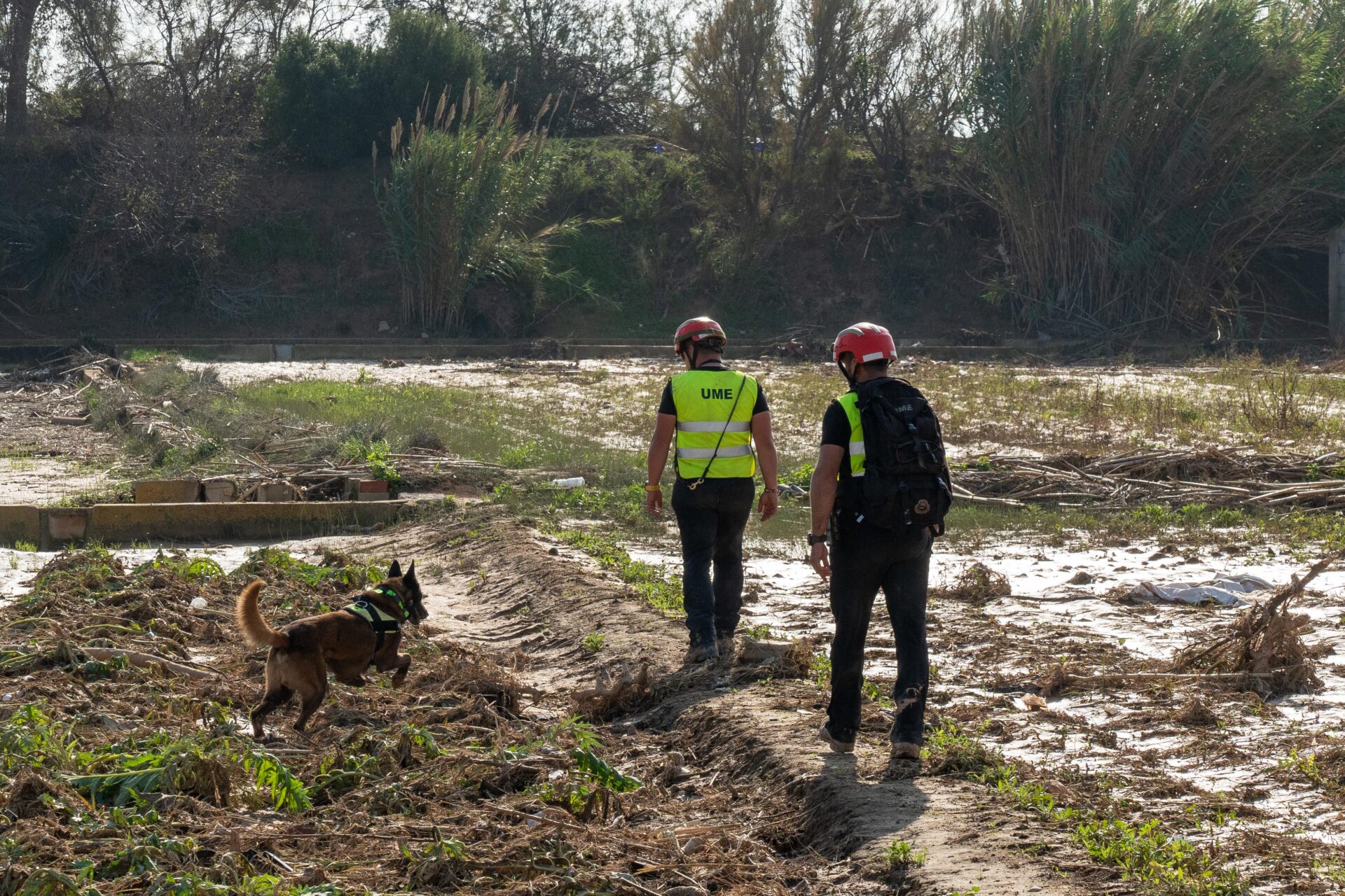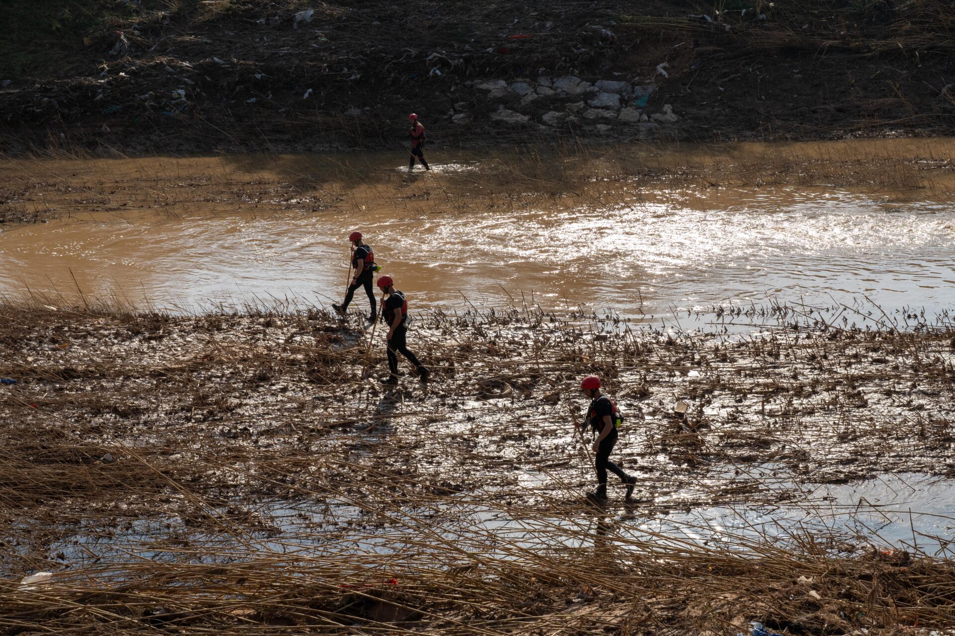 Mediante batidas a pie, con la ayuda de kayaks y con los perros, peinan un área en Massanasa (Valencia), a donde fueron arrastrados cientos de vehículos y numerosos efectos humanos y de viviendas camino del Mediterráneo
