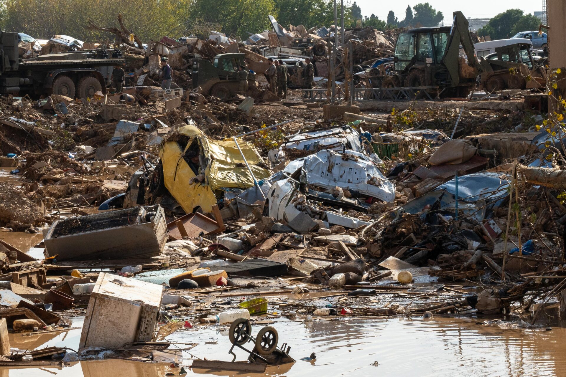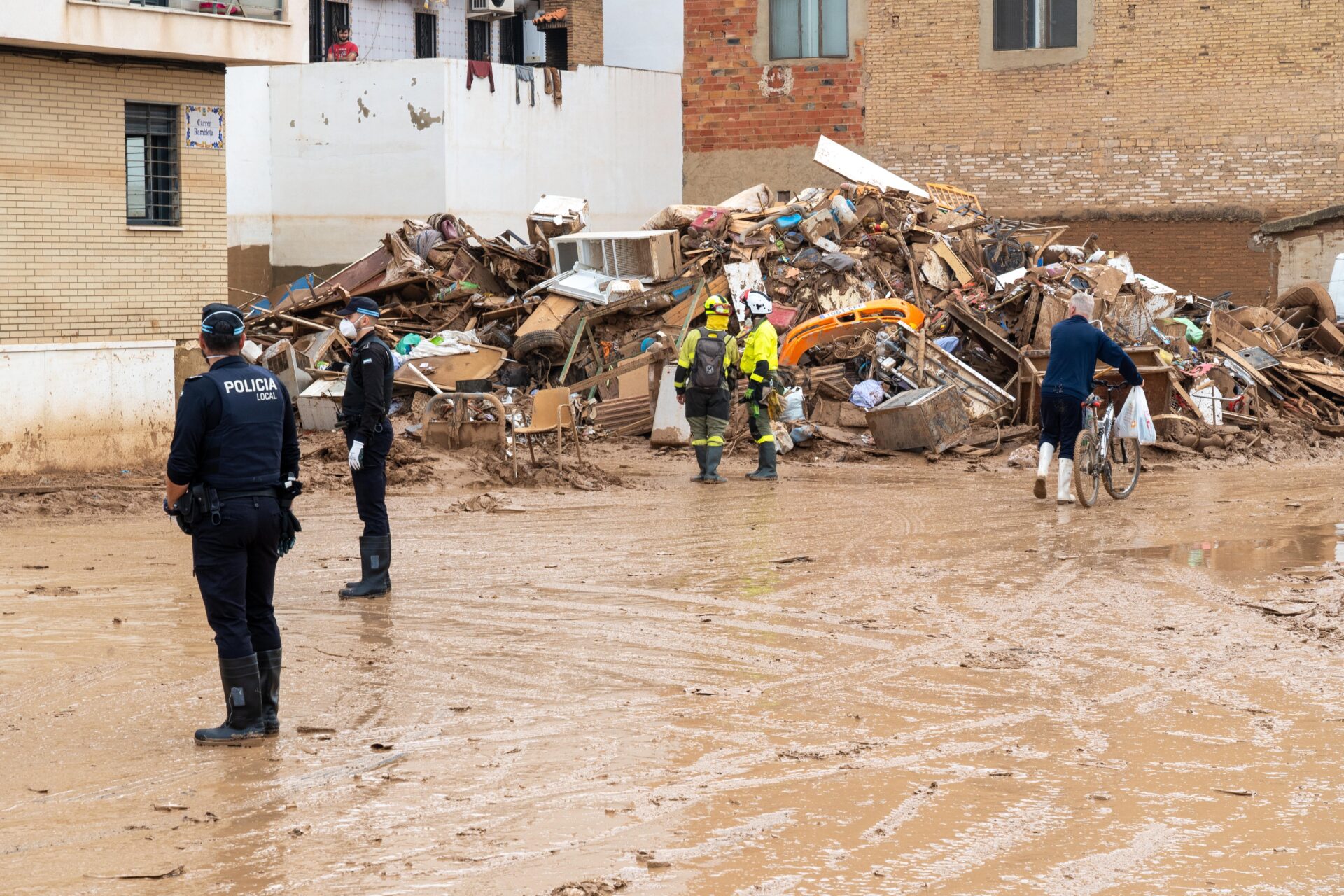 Un nuevo puente, sin vallas, lleno de maleza y con juncos arrastrados por la Rambla del Poyo se sitúa delante. Parece mentira, pero hoy este cauce casi no lleva agua. Tras ese paso, aparece Massanassa, y nada más llegar, integrantes del Ejército de Tierra dirigen grupos de voluntarios para un trabajo más ordenado. En esta localidad, y más adelante en Paiporta, la calle todavía se asemeja a arenas movedizas. En algunas esquinas, el fango salpica al paso de los vehículos de emergencia. Algunos de ellos se detienen en las farmacias, únicos establecimientos que han podido abrir tras un trabajo extenuante de los voluntarios desde el primer día, debido a su importante servicio público.