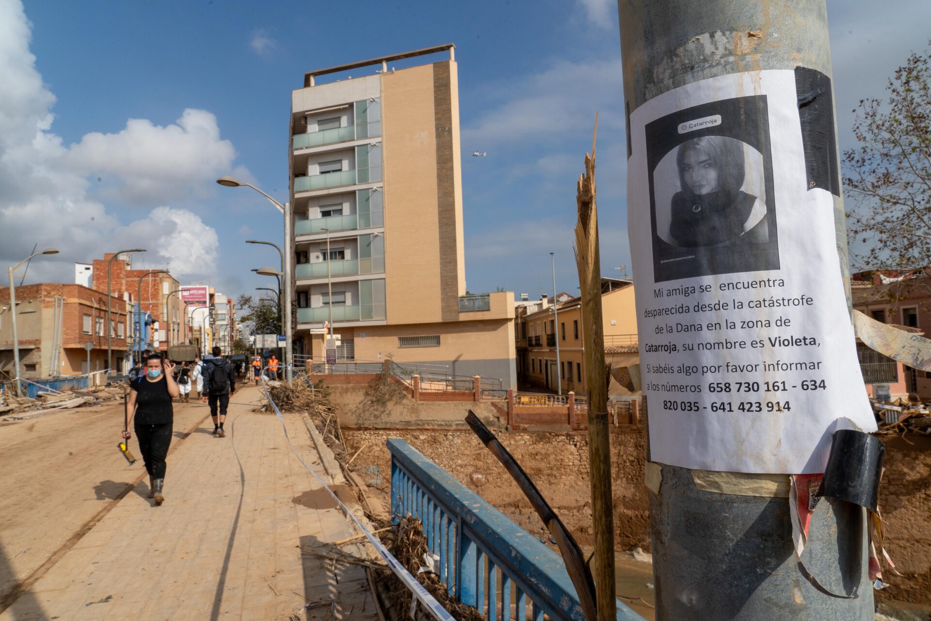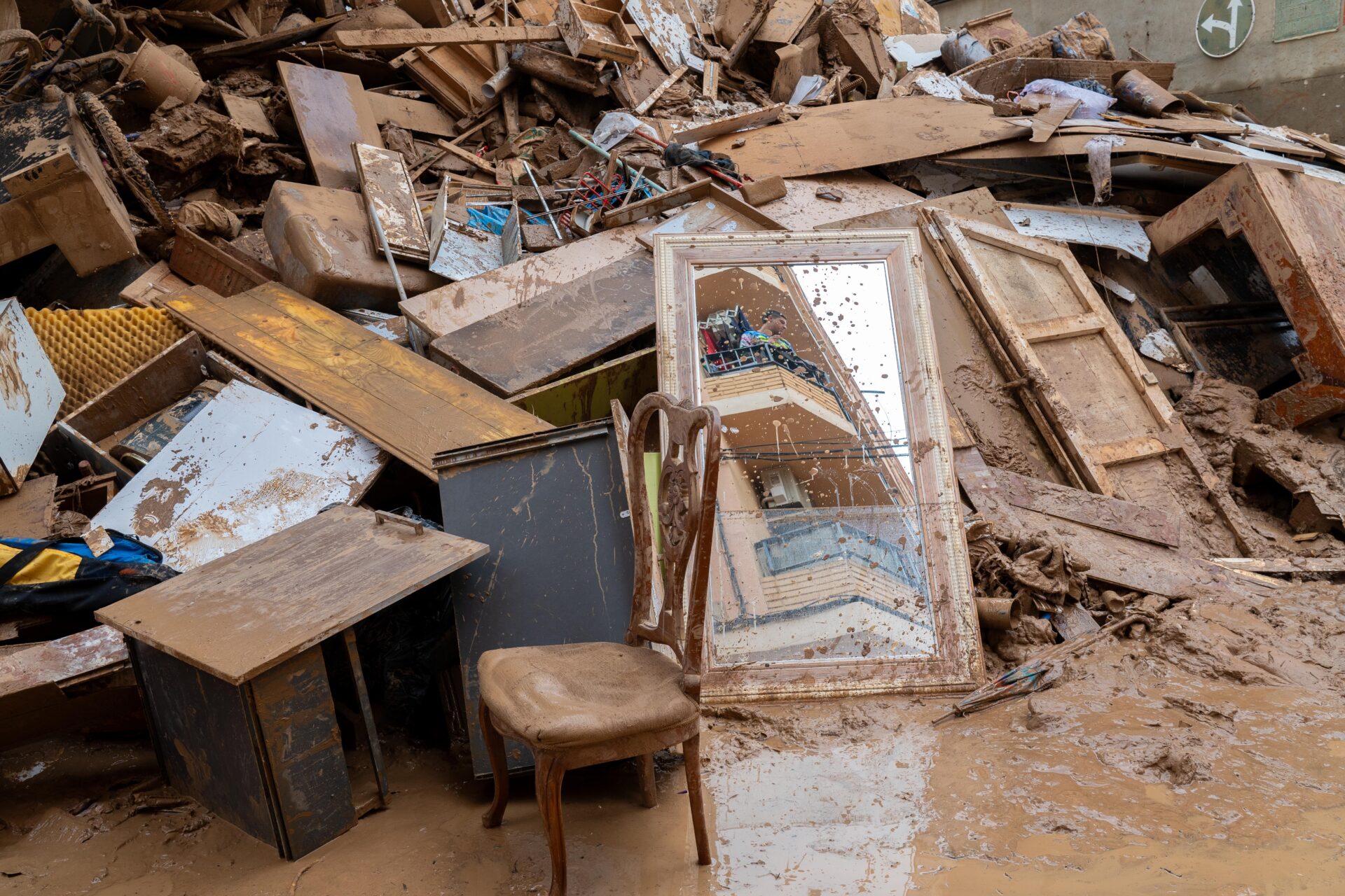 Una gran avenida une siete pueblos, desde Beniparrel hasta La Torre. Solo una calle separa Albal de Catarroja, donde la imagen empeora a cada metro. Una estantería y un espejo roto, como símbolo de la situación, se anteponen en el camino, en el que los tractores, los remolques y la maquinaria pesada se afanan en liberar todo un conglomerado de escombros, que a algunos les provocan cortes en su manos y pinchazos en la planta de los pies, motivo por el que los sanitarios han aconsejado vacunarse del tétanos a voluntarios y vecinos.