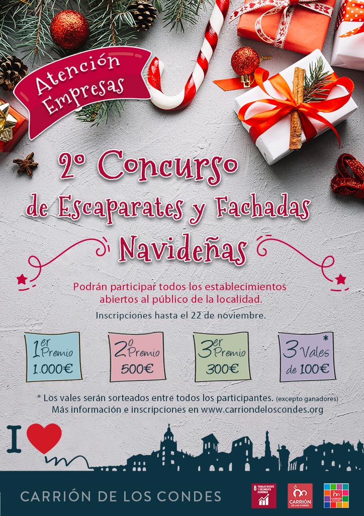 El Ayuntamiento de Carrión de los Condes, a través de la Concejalía de Comercio y Empleo, convoca el “II Concurso de Escaparates y fachadas navideñas de Carrión de los Condes”, para la dinamización y fomento de las empresas de la localidad, con objeto de crear un ambiente más festivo y acogedor en esas fechas, que impulsen las compras en las empresas locales así como la llegada de visitantes atraídos por la decoración ornamental del municipio.