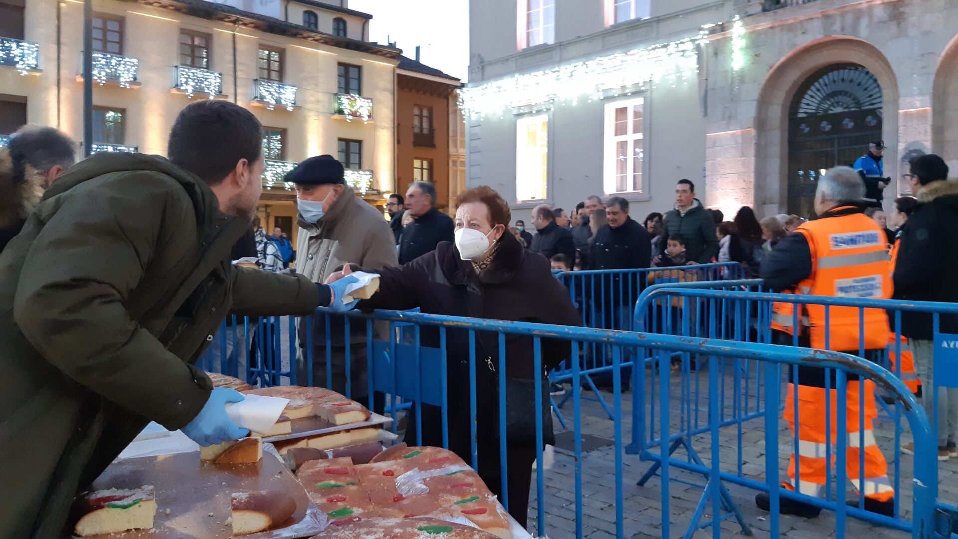 Un gran roscón que da la vuelta a la plaza mayor. Pero si piensa en la longitud de este dulce, compuesto por cientos de piezas, más le asombrarán las colas que llegan a generarse para tomar parte en esta tradición. Porque ha habido años en los que esas filas de personas para recibir de manos de los concejales este dulce, no solo salen de la Plaza Mayor, sino que ganan la Calle Mayor y llegan hasta cerca de la sede administrativa del Ayuntamiento en Agustinas Canónigas.