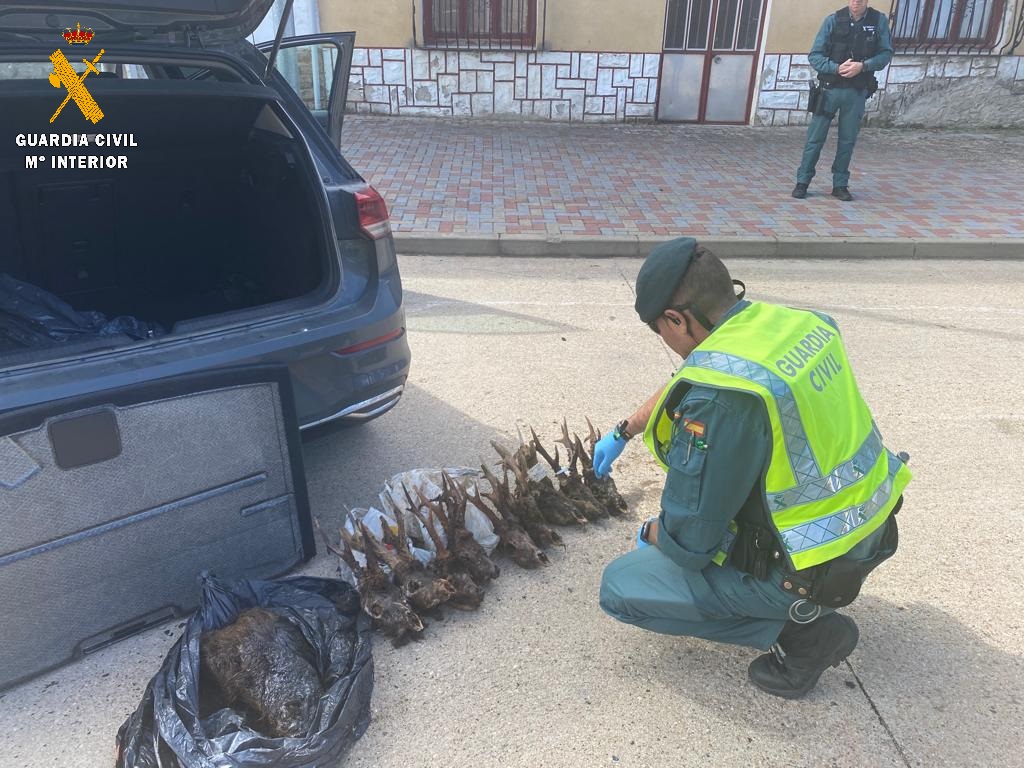 En un control preventivo de la caza furtiva en una carretera próxima a la localidad de Cervera de Pisuerga (Palencia), los agentes hallaron en el maletero de un vehículo y escondidas en la zona de la rueda de repuesto un total de nueve cabezas de corzo macho trofeos y un jabalí trofeo (en muy mal estado), así como diversos útiles de caza (prismáticos, cámara fotográfica, mochila con ropa de caza y una navaja).