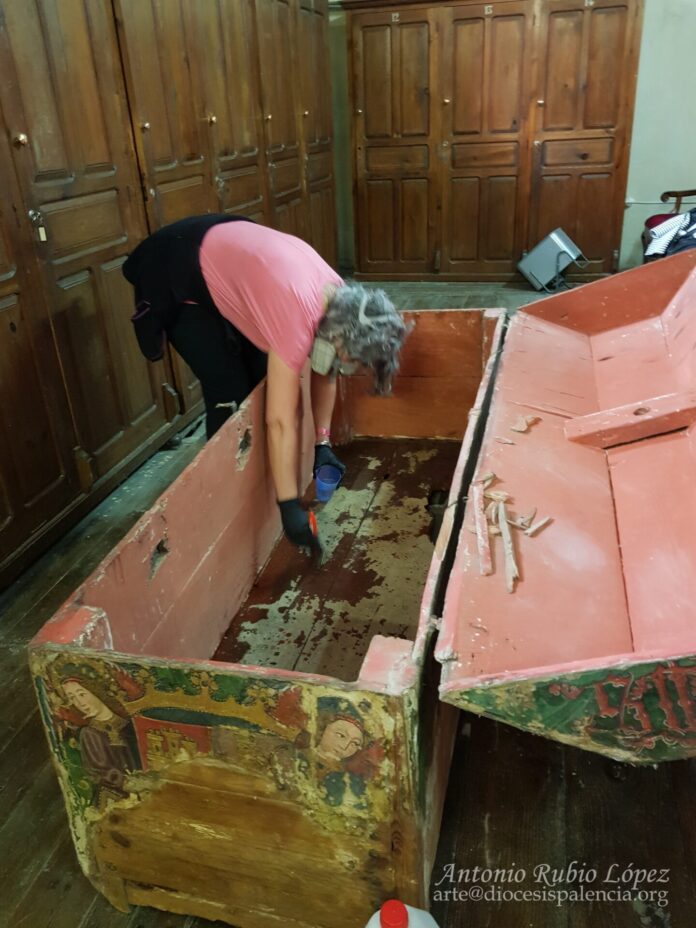 Posteriormente, la restauradora ha procedido a los trabajos de desinsectación y protección contra los xilófagos, reposición de faltas en la tablazón del fondo, refuerzo y consolidación. No ha sido, por lo tanto, una intervención en la policromía exterior ni una restauración del mueble, sino tan solo reparación y refuerzo de la base, a fin de frenar el deterioro y garantizar su futura estanqueidad.