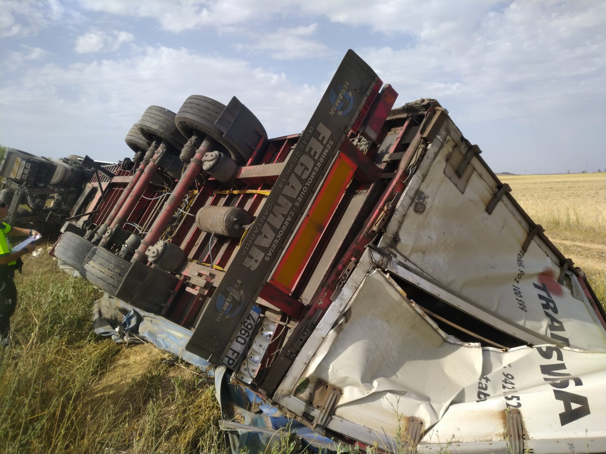 A consecuencia del impacto, el camión articulado se salió de la vía en un punto, en el punto kilométrico 43, entre Frómista y Marcilla, en el que existe un llamativo desnivel en forma de talud de varios metros de altura. Tras llevarse la bionda de protección, el vehículo articulado acabo volcado en el camino paralelo a la autovía, mientras que el turismo quedó accidentado en la calzada.