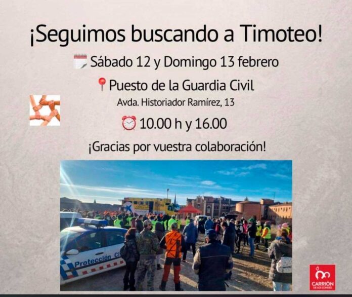 Por ello, la familia de la mano del Ayuntamiento de Carrión de los Condes ha vuelto a impulsar la convocatoria de nuevas batidas de búsqueda de Timoteo. Al igual que la semana pasada, la cita tendrá lugar este sábado 12 y el domingo 13 de febrero a las 10.00 horas y a las 16.00 horas en el Cuartel de la Guardia Civil de Carrión de los Condes -ubicado en la Avenida Historiador Ramírez, 13-, con el fin de localizar el paradero de Timoteo Pérez Arconada.