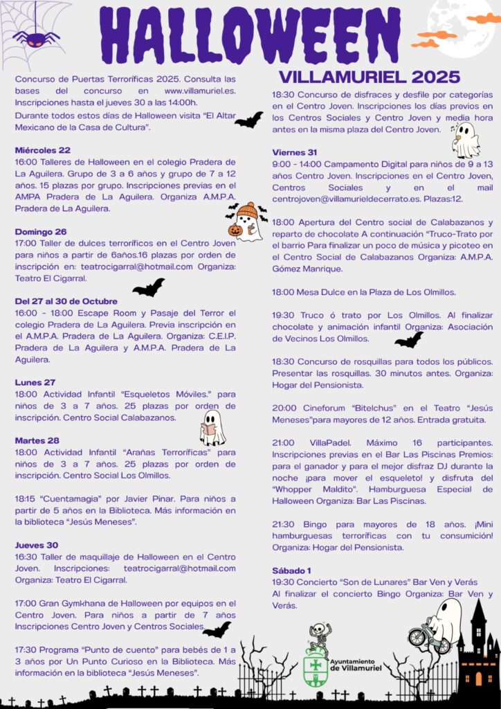 Gracias a la colaboración de asociaciones, AMPAS y negocios locales, Villamuriel vivirá un auténtico “fin de semana de miedo”, con talleres, concursos, espectáculos, desfiles, cine, música y muchas sorpresas para todas las edades.