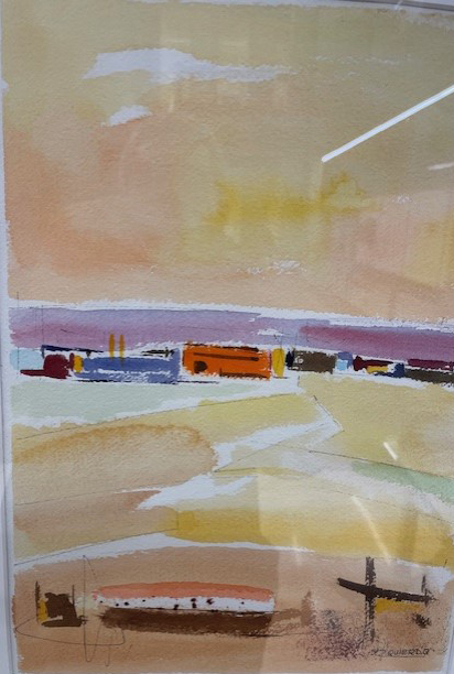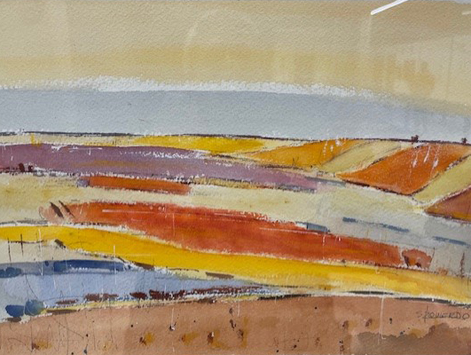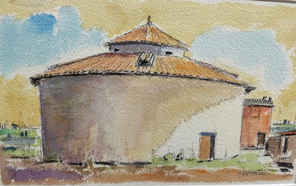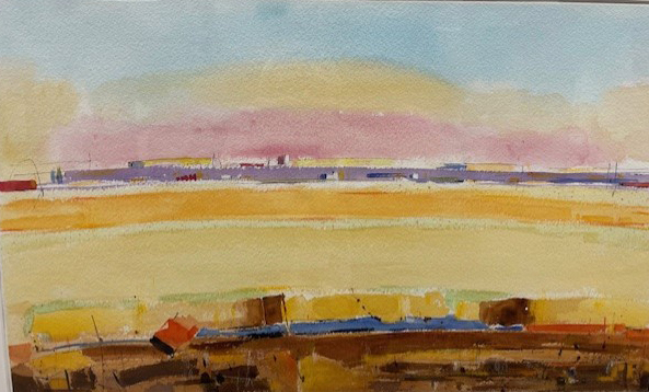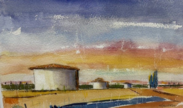 Las acuarelas, con su suave, transparente y delicada pincelada, reflejan paisajes de campo y arquitecturas rurales, todo ello bañado en una luz natural esplendorosa. Dos cuadros muestran esos elementos tan típicos de Tierra de Campos que son los palomares, perfectamente definidos por finos trazos de dibujo. Son piezas estas más realistas, que se alejan de la atmósfera intima que rodea los campos castellanos en su pintura.
