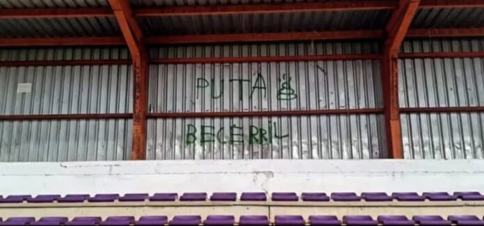 Además, han compartido desde el Becerril un par de imágenes en las que se ven las siguientes pintadas en el bar y en la grada del campo Mariano Haro: