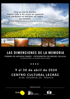 El Centro Cultural Lecrác acoge hasta el próximo 30 de abril la exposición ‘Las Dimensiones de la Memoria’, que podrá visitarse de lunes a viernes en horario de 9 a 21:45 h; los sábados de 9 a 14 h y de 17 a 21:45 h y los domingos y 23 de abril, de 10 a 14 h. La muestra presenta siete poemas de Arcadio Pardo y los enlaza con la fotografía de Miguel Calleja en su evocación del patrimonio natural y artístico de la tierra castellana.