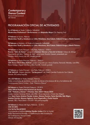 Por su parte, la masterclass profesional se celebrará el 3 y 4 de febrero en el Teatro Calderón de Valladolid y tendrá como maestro al bailarín y coreógrafo Alejandro Moya, quien desde el año 2020 trabaja en la prestigiosa compañía belga Peeping Tom. Esta propuesta suma nueve horas de formación y la realización de una performance final en el Salón de los Espejos del Teatro el día 4 a las 14.30 horas. En el caso de las masterclass, la inscripción se realiza a través de www.cdcdanza.com.