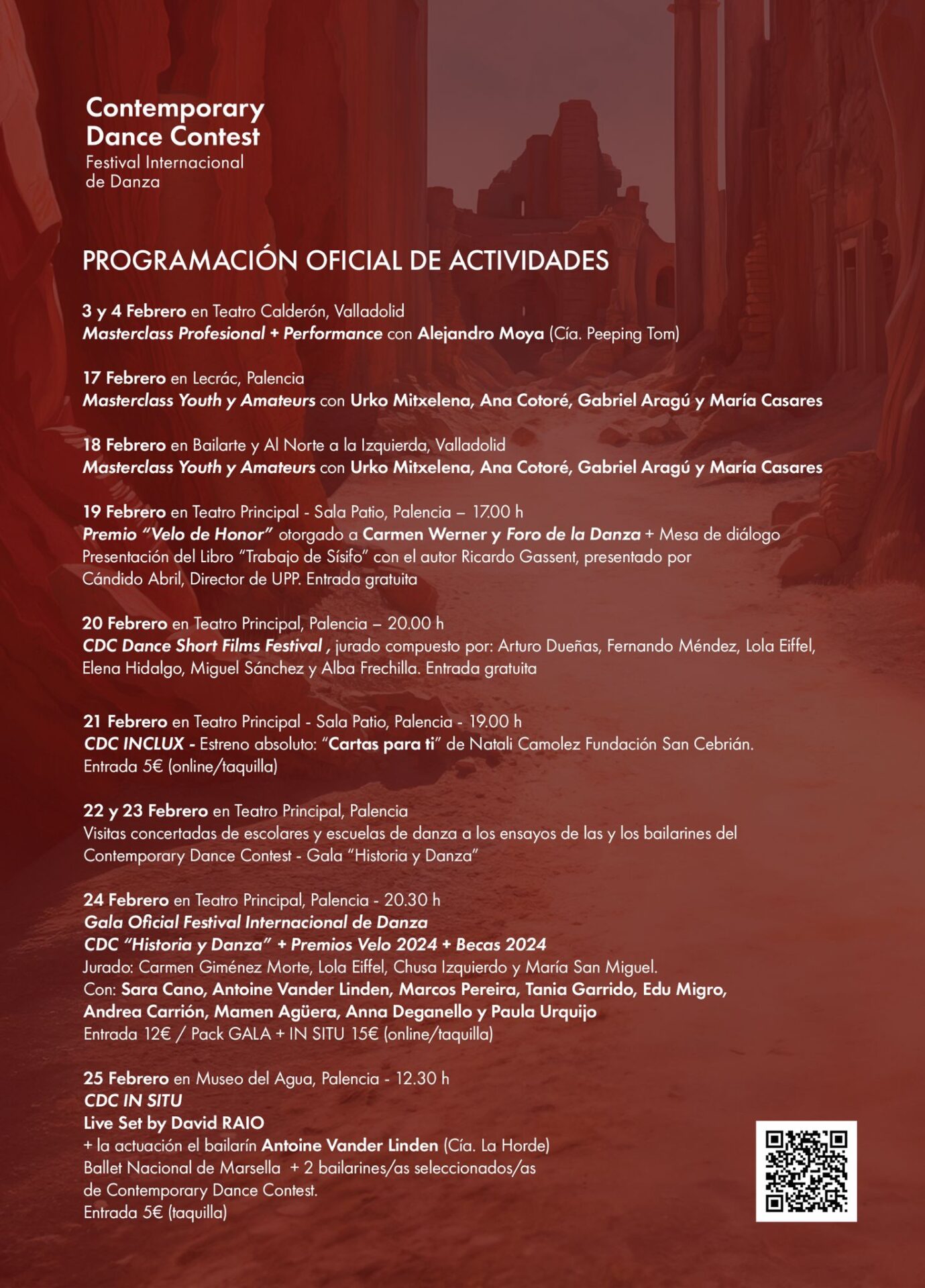 A todos ellos se suma el premio del Público, que se entregará el domingo 25 de febrero en el Museo del Agua, donde tendrá lugar el CDC IN SITU, que clausurará el Festival Internacional con un LIVE AV del artista multidisciplinar David Raio, la coreografía de Vander Linden y trabajos de dos participantes en la Gala.