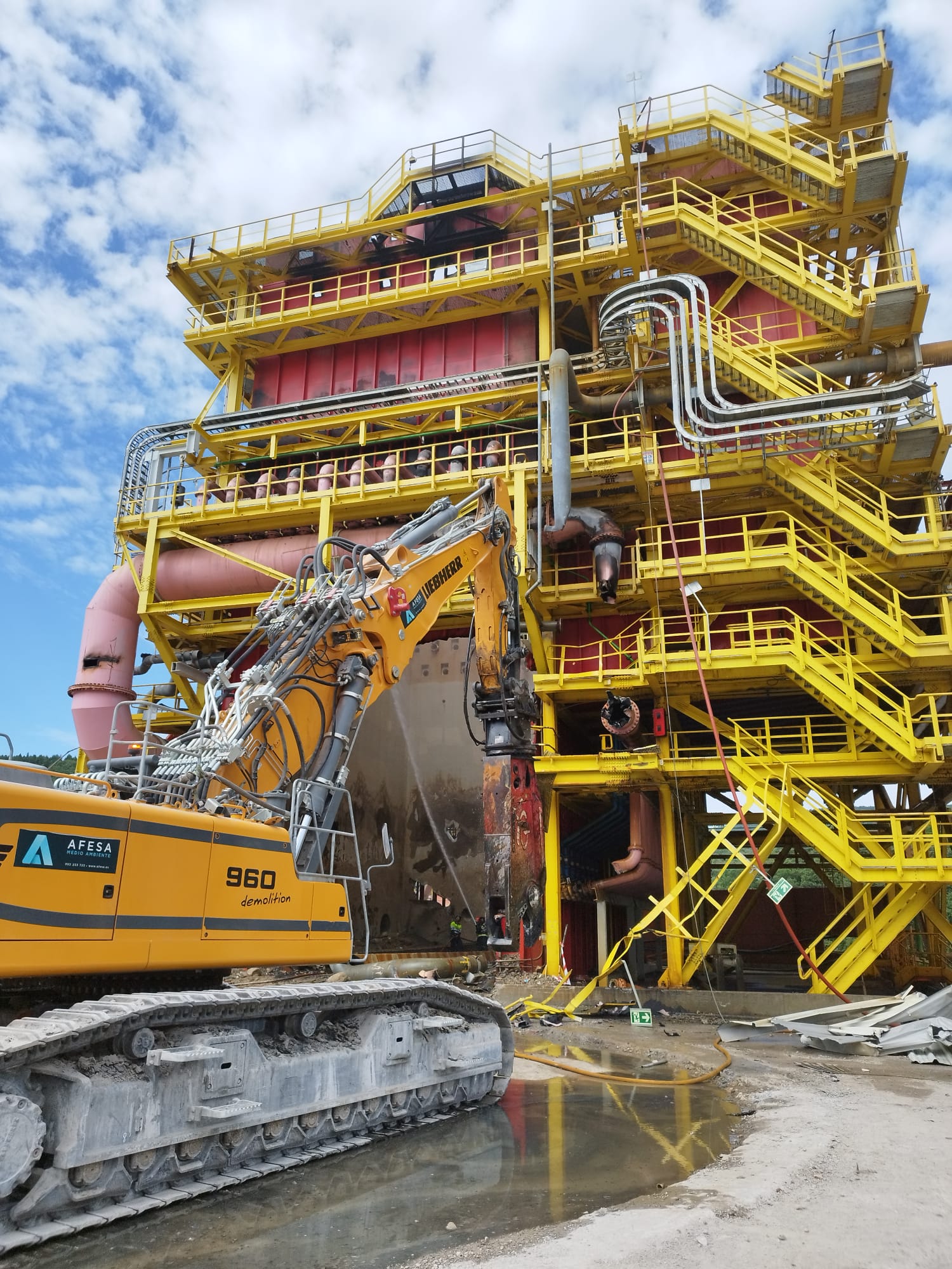 Zona en la que se produjo el incendio debido al trabajo de desmantelamiento. Bajo la gigantesca estructura se puede apreciar la presencia de los bomberos de la Diputación.