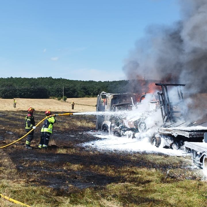 En concreto uno que accedió a una finca ya cosechada y que llevaba un tractor empacador y una máquina de carga tipo Manitou. Debido a la temperatura del motor, el tubo de escape o las ruedas, la paja y el rastrojo prendió, comenzando a calcinar el camión, así como la superficie cosechada y segada de alrededor.